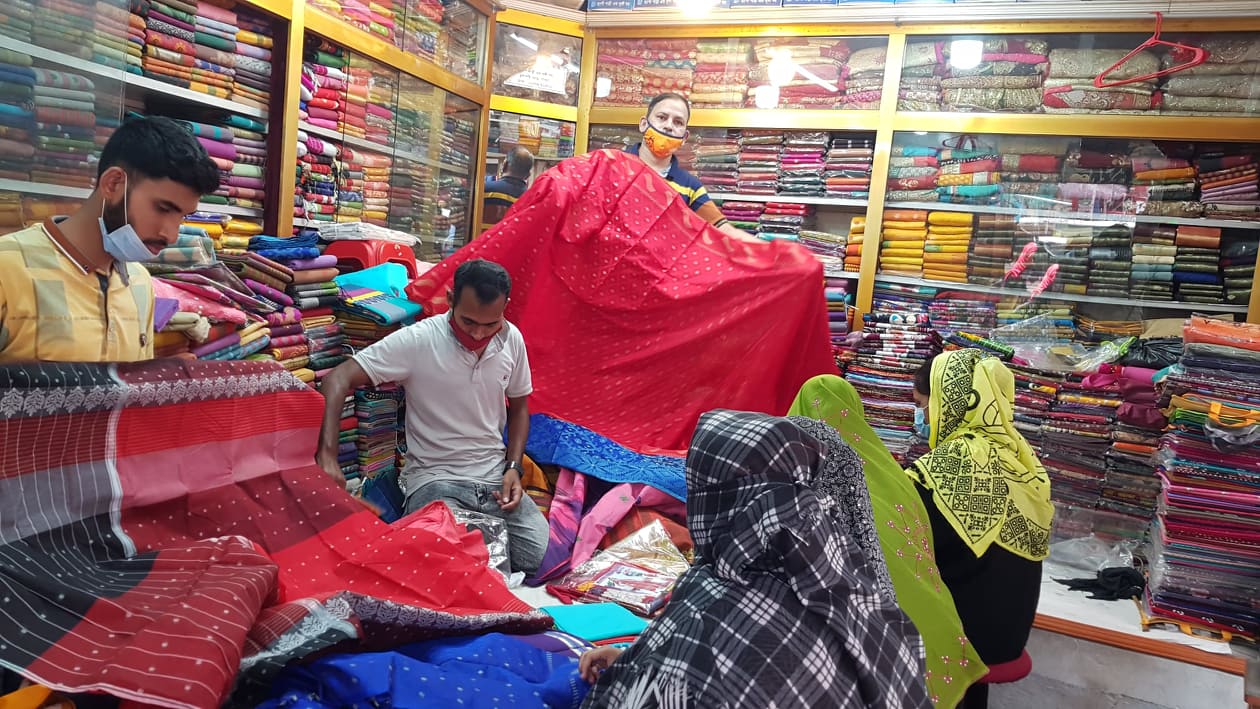 এস এম আলম, ৪ মে: ঈদ উল ফিতর কে সামনে রেখে করোনা ভাইরাসে নিরাপদ দূরত্ব নিশ্চিত করে বিক্রেতাদের জন্য আকর্ষনীয় শাড়ী বিক্রয়ে ব্যাস্ত পাবনা হ্যাপি শাড়ী এন্ড লুঙ্গী ঘর । ছবিটি পাবনা নিউ মার্কেট এলাকা সংলগ্ন হ্যাপি শাড়ী এন্ড লুঙ্গী ঘর ঘর থেকে নেয়া ।