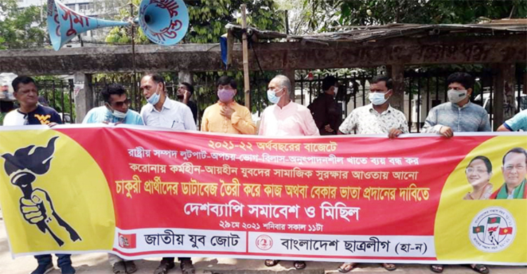 প্রস্তাবিত বাজেটে করোনায় কর্মহীন যুবকদের সামাজিক সুরক্ষার আওতায় আনা, বেকার যুবকদের ডাটাবেজ তৈরি করে কর্মসংস্থান অথবা বেকার ভাতা প্রদান, বেসরকারি কলেজ-বিশ্ববিদ্যালয়ের ওপর প্রস্তাবিত ১৫% আয়কর প্রত্যাহারের দাবিতে জাসদের সহযোগী সংগঠন জাতীয় যুব জোট এবং বাংলাদেশ ছাত্রলীগ (হা-ন) এর যৌথ উদ্যোগে মানববন্ধন ও সমাবেশ অনুষ্ঠিত হয়েছে।শনিবার সকালে জাতীয় প্রেস ক্লাবের সামনে এ সমাবেশ অনুষ্ঠিত হয়।