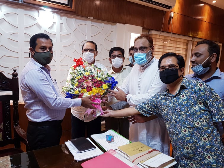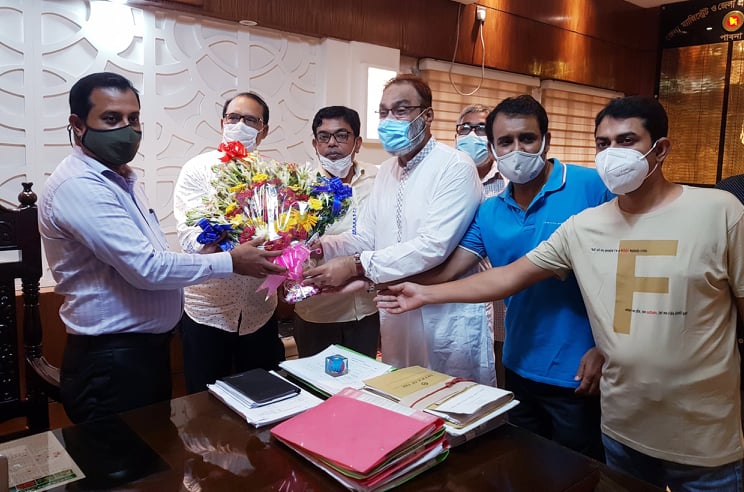 এস এম আলম, ২৪ জুন : পাবনা জেলা ইলেকট্রনিক্স এসোসিয়েশনের উদ্যোগে নবাগত জেলা প্রশাসক বিশ্বাস রাসেল হোসেনকে ফুলেল শুভেচ্ছা দেওয়া হয় জেলা প্রশাসকের কার্য্যালয়ে। এ সময় উপস্থিত ছিলেন পাবনা জেলা ইলেকট্রনিক্স এসোসিয়েশনের সভাপতি মফিজুর রহমান বাবলা, প্রতিষ্ঠাতা সভাপতি আবেদ হোসেন, সাধারণ সম্পাদক, মোঃ মাসুদুর রহমান মিন্টু, প্রচার সম্পাদক জাহিদ হোসেন, সহ-সাংগঠনিক সম্পাদক আব্দুল মুকিত সাবু, হক সুপার মার্কেট ব্যবসায়ী সমিতির সাধারণ সম্পাদক আরমান খান, এ আর প্লাজা ইলেকট্রনিক্স মার্কেট সমিতির সাধারণ সম্পাদক মেহেদী হাসান মিন্নুর, শাহ আলম মার্কেট, সভাপতি শাহান শফিউর রেজা নান্না, স্যামসাং শোরুম ম্যানেজার আব্দুল মতিন, স্কয়ার ইলেকট্রনিক্স শোরুম ম্যানেজার শরিফুল ইসলাম, মোবাইল ডিসট্রিবিউশন সমিতির সাংগঠনিক সম্পাদক কবির মাহমুদ বিপ্লব, ইলেকট্রনিক্স ব্যবসায়ী মাহমুদ হোসেন জনি প্রমুখ। এ সময়ে জেলা প্রশাসক বলেন যে, কম্পিউটার, মোবাইল ও ইলেক্ট্রনিক্স ব্যবসায়ীরা ডিজিটাল দেশ গড়ার সহায়ক সামগ্রী উৎপাদনকারী ও বিক্রেতা। তিনি আরও বলেন সবাইকে সামাজিক দূরত্ব বজায় রেখে এবং মাস্ক পরে ব্যবসা পরিচালনা করতে।