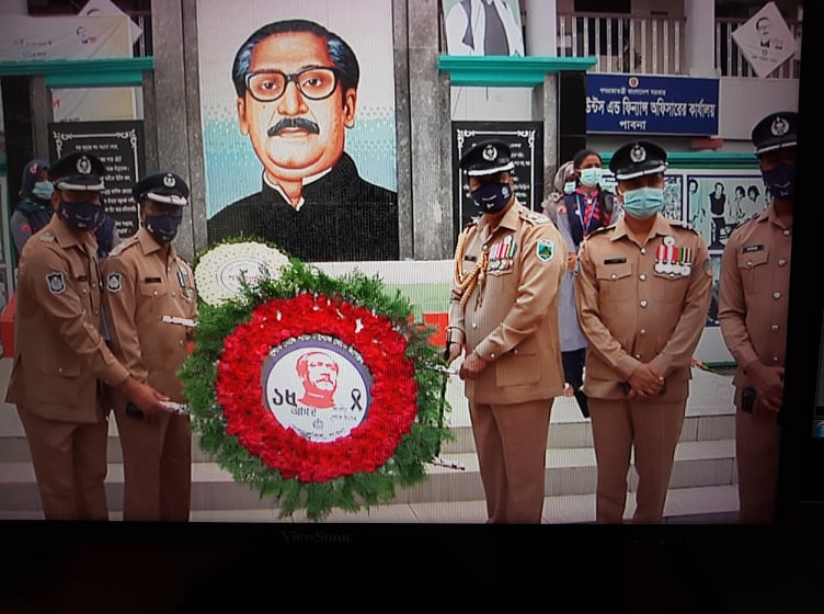 পাবনায় জাতির জনক বঙ্গবন্ধু শেখ মুজিবুর রহমানের ৪৬তম শাহাদৎ বার্ষিকী ও জাতীয় শোক দিবস উপলক্ষে বঙ্গবন্ধু শেখ মুজিবুর রহমানের প্রতিকৃতিতে জেলা পুলিশের শ্রদ্ধাঞ্জলি