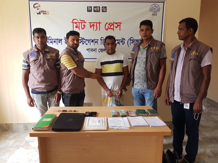পাবনায় বিপুল পরিমান জাল দলিল, পাসপোর্ট, নাগরিক, জন্ম ও মৃত্যু সনদ এবং বিভিন্ন গুরুত্বপুর্ন ব্যক্তির স্বাক্ষরযুক্ত সিলমোহর সহ এক ব্যক্তিকে আটক
