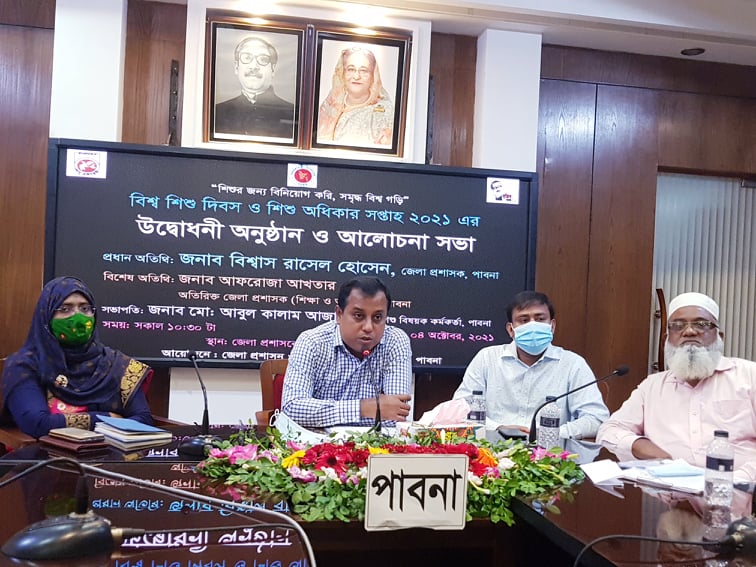 এস এম আলম, ৪ অক্টোবর : বিশ্ব শিশু দিবস ও শিশু অধিকার সপ্তাহ ২০২১ এর উদ্বোধনী অনুষ্ঠান উপলক্ষে জেলা প্রশাসকের সম্মেলন কক্ষে আলোচনায় বক্তব্য দেন প্রধান অতিথি জেলা প্রশাসক বিশ্বাস রাসেল হোসেন, এছাড়া বিশেষ অতিথি হিসেবে উপস্থিত ছিলেন অতিরিক্ত জেলা প্রশাসক (আইসিটি) আফরোজা আকতার, জেলা শিশু বিষয়ক কর্মকর্তা আবুল কালাম আজাদ, জেলা শিক্ষা অফিসার এস এম মোসলেম উদ্দিন, জেলা প্রাথমিক শিক্ষা অফিসার আব্দুর রাজ্জাক,পাবনা জেলা স্কুলের প্রধান শিক্ষক হুজ্জাতুল্লাহ, জেলা ক্রীড়া অফিসার রফিকুল ইসলাম, শিশুু একাডেমীর সদস্য প্রলয় চাকী ও জেলার বিভিন্ন স্কুলের প্রধান শিক্ষক ও ছাত্রছাত্রীবৃন্দ।