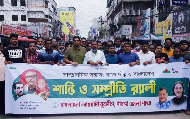 এস এম আলম, ১৯অক্টোবরঃ রংপুর ও কুমিল্লায় সাম্প্রদায়িক সহিংসতার প্রতিবাদে কেন্দ্রীয় কর্মসুচীর অংশ হিসেবে সম্প্রীতি ও শান্তি শোভাযাত্রা ও সমাবেশ করেছে পাবনা জেলা আওয়ামী যুবলীগ ও সেচ্ছাসেবক লীগ সহ বিভিন্ন অঙ্গসংগঠন।। দুপুরে জেলা আওয়ামীলীগ কার্যালয় থেকে শোভাযাত্রাটি বের হয়ে শহরের প্রধান প্রধান সড়ক প্রদক্ষিণ করে। শোভাযাত্রা শেষে জেলা আওয়ামীলীগ কার্যালয় অনুষ্ঠিত হয় সমাবেশ। সমাবেশে বক্তব্য দেন জেলা আওয়ামী যুবলীগ এর আহবায়ক আলী মর্তুজা বিশ্বাস সনি । সমাবেশে সাম্প্রদায়িক শক্তিকে প্রতিহত করার আহবান জানান আলী মর্তুজা বিশ্বাস সনি সহ জেলা আওয়ামীলীগ এর নের্তৃবৃন্দ।