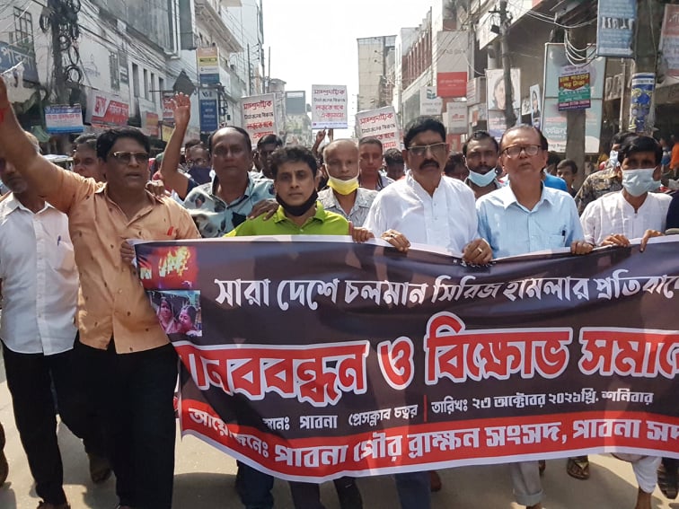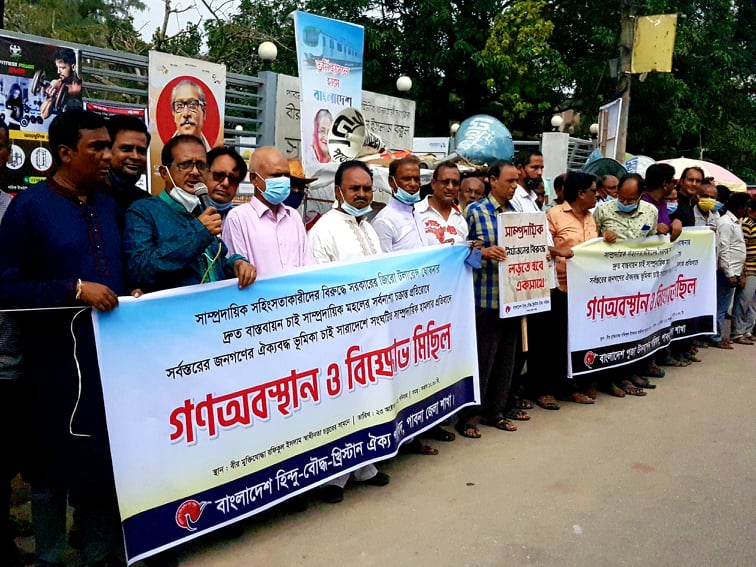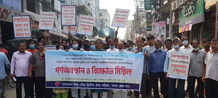 এস এম আলম, ২৩ অক্টোবর : সাম্প্রদায়িক সহিংসতার প্রতিবাদে দেশব্যাপী কর্মসূচীর অংশ হিসেবে পাবনায় গনঅবস্থান এবং বিক্ষোভ মিছিল করেছে বাংলাদেশ হিন্দু বৌদ্ধ খ্রিস্টান ঐক্য পরিষদ ও পুঁজা উৎযাপন পরিষদ জেলা শাখা।সকালে স্থানীয় বীর মুক্তিযোদ্ধা রফিকুল ইসলাম বকুল স্বাধিনতা চত্বরের সামনে আয়োজিত এ গণঅবস্থান চলাকালে বক্তব্য দেন জেলা হিন্দু-বৌদ্ধ-খ্রিস্টান ঐক্য পরিষদের সভাপতি চন্দন কুমার চক্রবর্তী, সাধারন সম্পাদক বিনয় জ্যোতি কুন্ডু, জেলা পুঁজা উৎযাপন পরিষদের সভাপতি প্রভাষ ভদ্র, সাধারণ সম্পাদক বাদল ঘোষ, সাংবাদিক রণেশ মৈত্র সহ স্থানীয় নেতৃবৃন্দ। বক্তারা অবিলম্বে সহিংসতাকারীদের গ্রেফতার ও দৃষ্টান্তমুলক শাস্তি দাবী করেন।পরে একটি বিক্ষোভ মিছিল শহর প্রদক্ষিন করে।