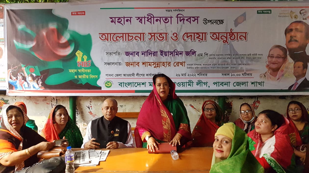 এস এম আলম, ২৬ মার্চঃ নানা অনুষ্ঠানিকতায় উৎসবমুখোর পরিবেশে পাবনায় পালিত হয়েছে মহান স্বাধীনতা দিবস । এ উপলক্ষে সকালে দুর্জয় পাবনায় শ্রদ্ধা নিবেদন করেন সংরক্ষিত সংসদ সদস্য ও পাবনা মহিলা আওয়ামীলীগ এর সভাপতি নাদিরা ইয়াসমিন জলি এমপি সহ পাবনা মহিলা আওয়ামীলীগ এর নের্তৃবৃন্দ।