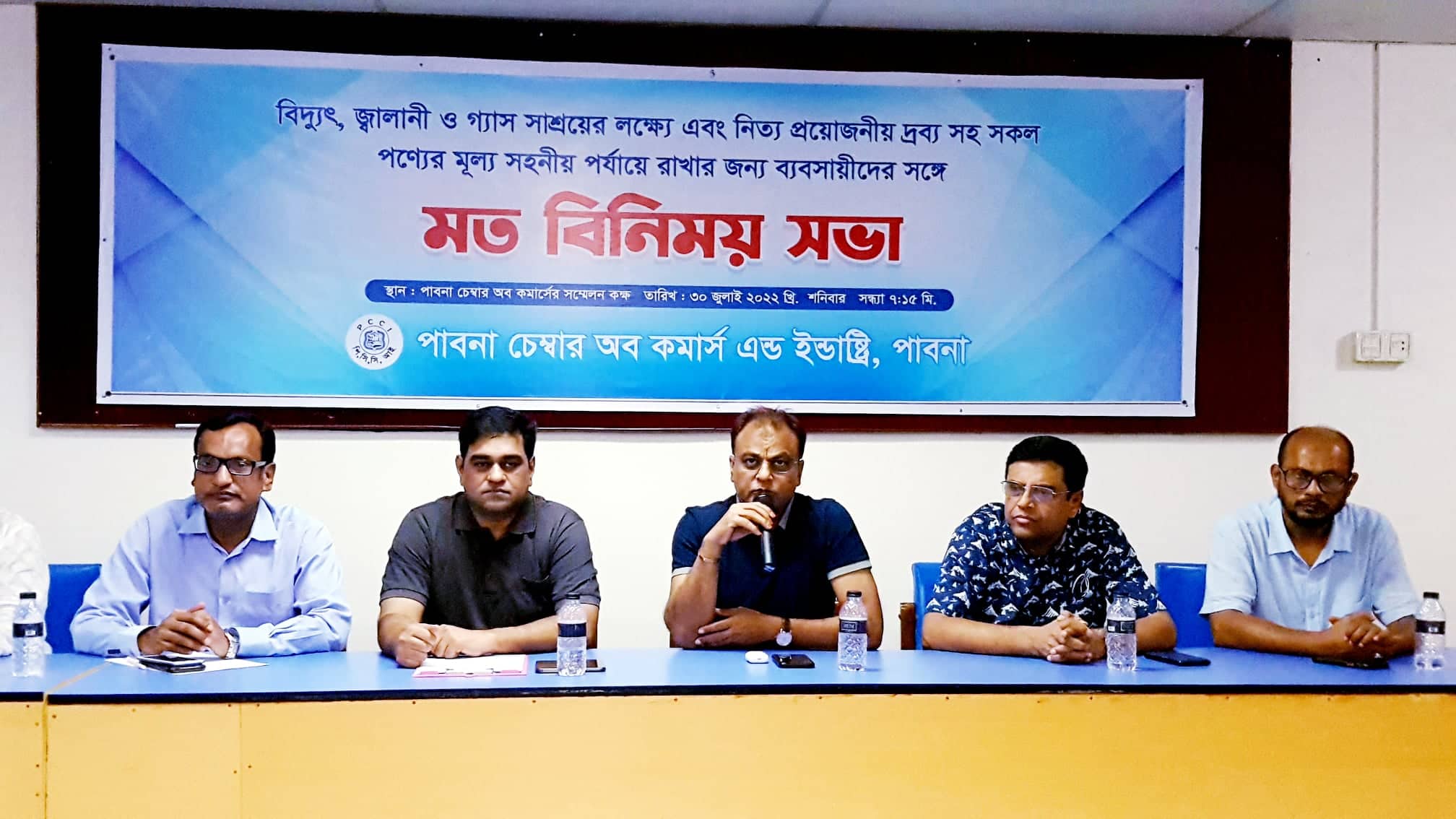 পাবনায় সরকারি নির্দেশনা মোতাবেক বিদ্যুৎ, জ্বালানী ও গ্যাস সাশ্রয়ে চেম্বার অব কমার্স এন্ড ইন্ডাস্ট্রিজ এর উদ্যোগে ব্যবসায়ীদের সাথে মত বিনিময় সভা