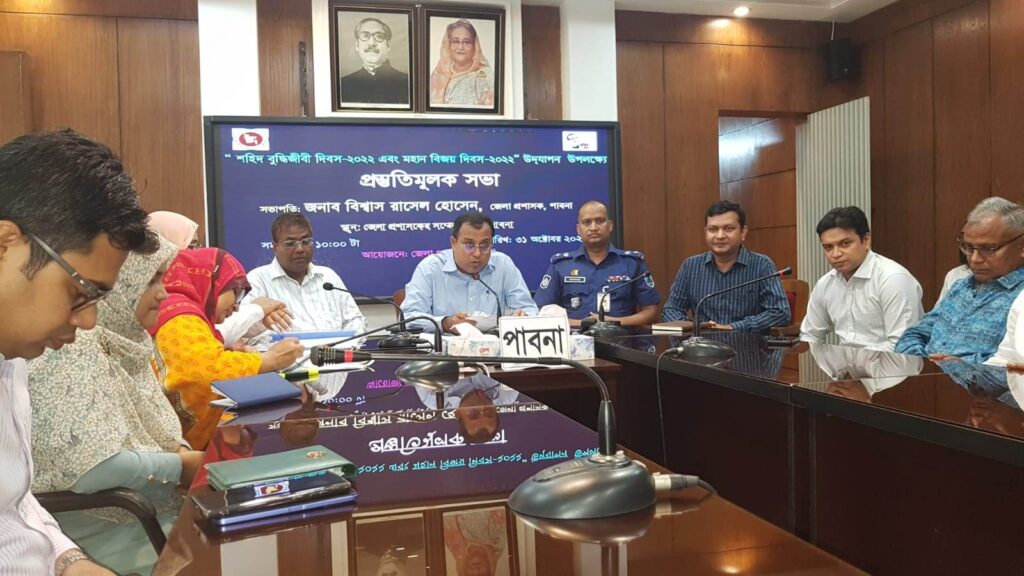 এস এম আলম, ৩১ অক্টোবর : যথাযথ মর্যাদায় মহান বিজয় দিবস ও শহীদ বুদ্ধিজীবি দিবস উদযাপনের লক্ষ্যে পাবনায় অনুষ্ঠিত হয়েছে প্রস্তুতি সভা। সকালে জেলা প্রশাসকের সম্মেলন কক্ষে জেলা প্রশাসক বিশ্বাস রাসেল হোসেনের সভাপতিত্বে এ সভায় বক্তব্য দেন পুলিশ সুপার আকবর আলী মুনসী, জেলা পরিষদের প্রধান নির্বাহী কর্মকর্তা কাজী আতিউর রহমান, সিভিল সার্জন ডা. মনিসর চৌধুরী,অতিরিক্ত জেলা প্রশাসক আফরোজা আক্তার, অতিরিক্ত জেলা ম্যাজিস্ট্রেট আবদুল্লাহ আল মামুন,উপজেলা নির্বাহী কর্মকর্তা তাহমিনা আক্তার রেইনা, সহকারী কমিশনার ভুমি শওকত মেহেদী সেতু, জেলা মুক্তিযোদ্ধা সংসদের সাবেক কমান্ডার হাবিবুর রহমান হাবিব, উপজেলা ভাইস চেয়ারম্যান শামসুন নাহার রেখা সহ বিভিন্ন সরকারী ও বেসরকারী দপ্তরের প্রধান, রাজনৈতিক নেতৃবৃন্দ সহ স্থানীয় সুশীল সমাজের প্রতিনিধিরা।