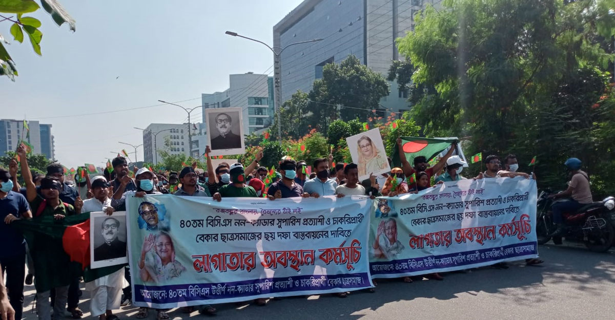 ৪০তম বিসিএস পরীক্ষায় উত্তীর্ণ নন-ক্যাডার সুপারিশপ্রাপ্ত প্রার্থীদের ছয় দফা দাবি নিয়ে টানা তৃতীয় দিনের মতো অবস্থান কর্মসূচি পালন করেছে চাকরিপ্রার্থীরা। কর্মসূচির অংশ হিসেবে বুধবার মুখে কালো কাপড় বেঁধে ও হাতে জাতীয় পতাকা নিয়ে প্রতিবাদ জানান তারা।তবে লাগাতার অবস্থান কর্মসূচিতে এখন পর্যন্ত সরকারি কর্ম-কমিশনের দায়িত্বশীল কেউ তাদের সঙ্গে যোগাযোগ করেনি। এর আগে দাবি না মানা হলে আমরণ অনশন কর্মসূচির ষোষণা দেয় চাকরিপ্রার্থীরা।বুধবার বেলা ১২টা থেকে রাজধানীর আগারগাঁওয়ের বাংলাদেশ পাবলিক সার্ভিস কমিশনের (পিএসসি) সামনে এ কর্মসূচি পালন করছেন তারা।