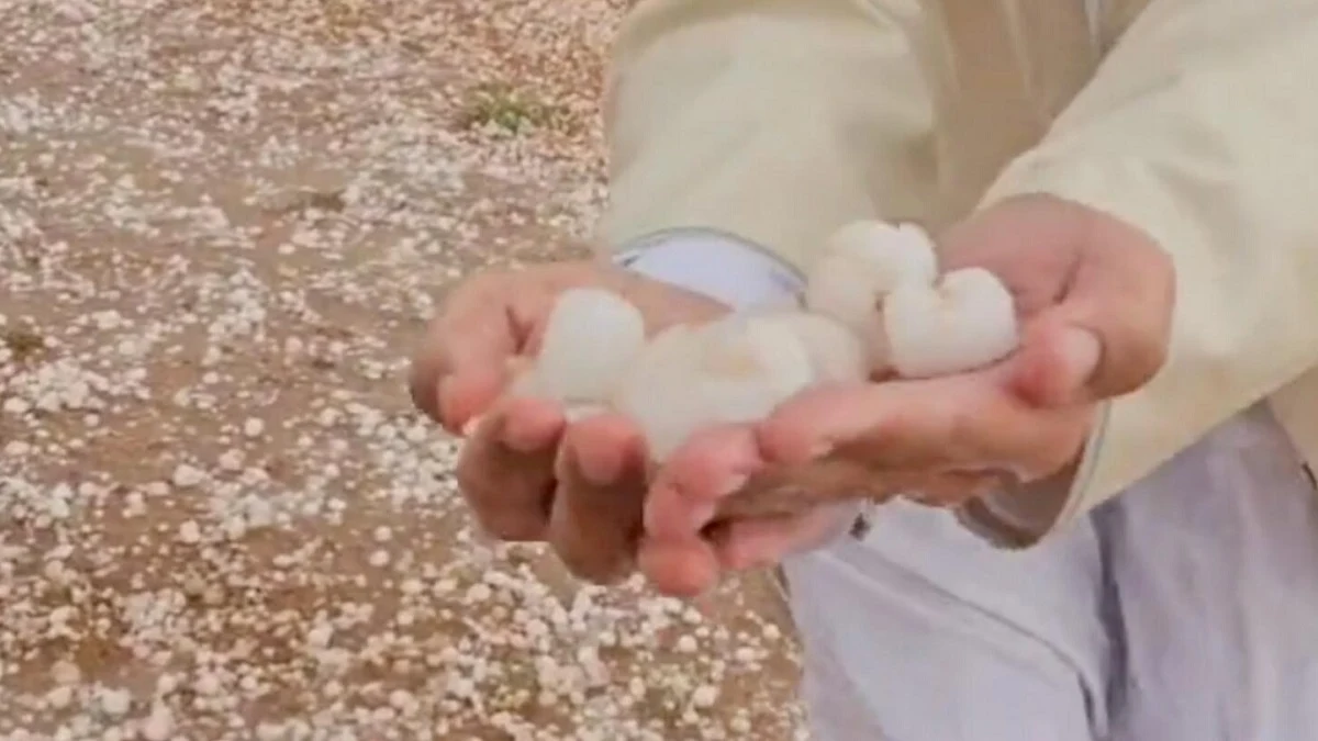 স্টর্ম সেন্টারের আরেকটি ভিডিওতে দেখা যায়, ফাহাদ মুহাম্মদ নামের এক বাসিন্দা কাদাপানির স্রোতের পাশে জমে থাকা শিলার ওপর হাঁটছেন। এরপর তিনি গোলাকৃতির শিলাগুলো কুড়াতে থাকেন। পরে তিনি শিলাগুলো হাতে নিয়ে ক্যামেরার কাছে এসে বিরল এ দৃশ্য দর্শকদের উদ্দেশে দেখাতে থাকেন।এদিকে সংযুক্ত আরব আমিরাতের আবহাওয়া দপ্তর বলেছে, বৃহস্পতিবার দুবাই ও খাত্ততে ভারি বৃষ্টি হয়েছে। স্থানীয় বাসিন্দাদের খারাপ আবহাওয়ার পূর্বাভাস দিয়ে কমলা ও হলুদ সতর্কবার্তা দেওয়া হয়েছে।গত বছরের শেষের দিকে ভারি বৃষ্টিতে তলিয়ে গিয়েছিল সৌদি আরবের একাংশ। বন্যা দেখা দিয়েছিল দেশটির পশ্চিমাঞ্চলে। কিন্তু সেই বৃষ্টি আশীর্বাদ হয়ে উঠেছিল দেশটির উত্তরাঞ্চলের জন্য। বাড়তি বৃষ্টির পর বেগুনি ফুলে ছেয়ে যায় সৌদির মরুভূমি। আর সেই মনোমুগ্ধকর দৃশ্য দেখতে দেশ-বিদেশ থেকে ছুটে যান সৌন্দর্যপিপাসু মানুষের দল।