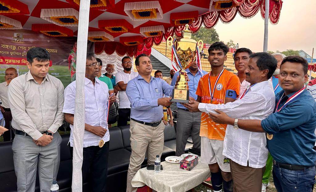 এস এম আলম, ১২ জুন: বাংলাদেশ যুব ও ক্রীড়া মন্ত্রনালয় এর উদ্যোগে জেলা প্রশাসন পাবনার আয়োজনে জাতির পিতা বঙ্গবন্ধু শেখ মুজিবুর রহমান আন্তঃ কলেজ ফুটবল টুর্নামেন্টের চ‚ড়ান্ত খেলা পাবনা জেলা শহীদ অ্যাডভোকেট আমিন উদ্দিন স্টেডিয়ামে অনুষ্ঠিত হয়। খেলায় পুরস্কার বিতরণ করেন জেলা প্রশাসক বিশ্বাস রাসেল হোসেন। খেলায় চ্যাম্পিয়ন পুরস্কার গ্রহণ করে দোগাছী স্কুল এন্ড কলেজ পাবনা সদর ও রানার্সআপ পুরস্কার গ্রহণ করেন ডা জহুরুল কামাল ডিগ্রি কলেজ সুজানগর। অনুষ্ঠানে উপস্থিত ছিলেন জেলা ক্রীড়া সংস্থার সাধারণ সম্পাদক শহিদুল হক মানিক, অতিরিক্ত জেলা প্রশাসক রাজস্ব আব্দুল্লাহ আল মামুন, অতিরিক্ত জেলা প্রশাসক সার্বিক শরিফ আহম্মেদ, অতিরিক্ত জেলা ম্যাজিস্ট্রেট জাহাঙ্গীর আলম, অতিরিক্ত জেলা প্রশাসক শিক্ষা আইসিটি মাহফুজা সুলতানা, দোগাছী স্কুল এন্ড কলেজের সহকারী প্রধান শিক্ষক আফসিন হোসেন ডেসা, আব্দুর জব্বার সহ বাংলাদেশ সরকার যুব ক্রীড়া মন্ত্রণালয় ও জেলা প্রশাসনের কর্মকর্তাবৃন্দ।