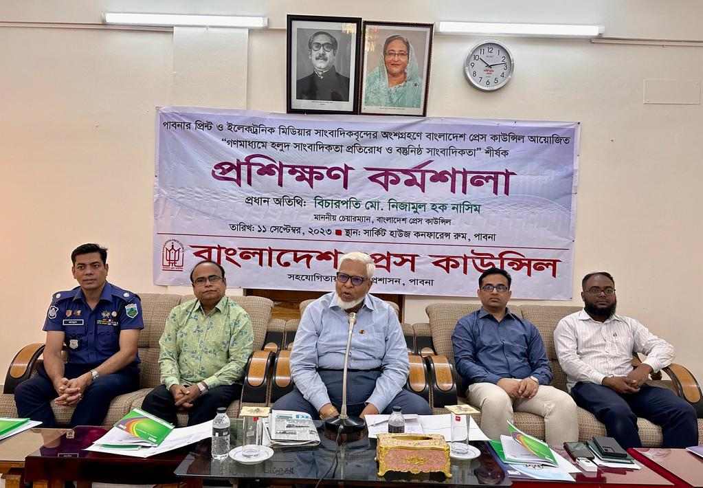 এস এম আলম, ১১ সেপ্টেম্বর: গনমাধ্যমে হলুদ সাংবাদিকতা প্রতিরোধ ও বস্তুনিষ্ঠ সাংবাদিকতা নিয়ে পাবনায় অনুষ্ঠিত হয়েছে প্রশিক্ষন কর্মশালা। সকালে পাবনা সার্কিট হাউজ মিলনায়তনে এ কর্মশালার উদ্বোধন করেন বাংলাদেশ প্রেস কাউন্সিলের চেয়ারম্যান বিচারপতি নিজামুল হক নাসিম। প্রশিক্ষন পরিচালনা করেন প্রেস কাউন্সিলের সচিব শ্যামল চন্দ্র কর্মকার। অনুষ্ঠানে বক্তব্য দেন অতিরিক্ত পুলিশ সুপার মাসুদ আলম, অতিরিক্ত জেলা প্রশাসক সার্বিক শরীফ আহম্মেদ ও জেলা সিনিয়র তথ্য কর্মকর্তা সামিউল আলম। কর্মশালায় বিভিন্ন গন মাধ্যমের ৫৫ জন সাংবাদিক অংশ গ্রহন করেন।