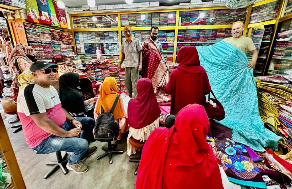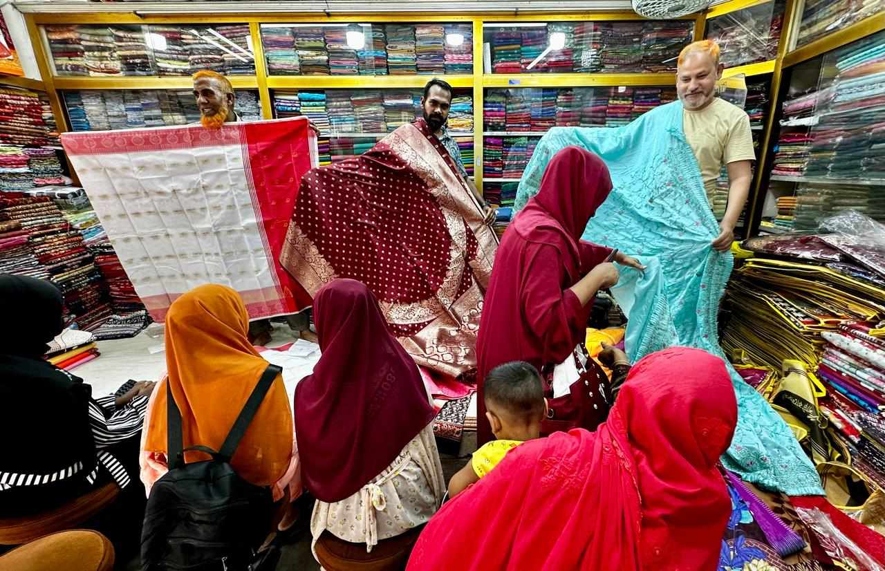 এস এম আলম, ৬ এপ্রিল: পবিত্র ঈদ উল ফিতর কে সামনে রেখে বিক্রেতাদের জন্য আকর্ষনীয় শাড়ী বিক্রয়ে ব্যাস্ত পাবনা হ্যাপি শাড়ী এন্ড লুঙ্গী ঘর । ছবিটি পাবনা নিউ মার্কেট এলাকা সংলগ্ন হ্যাপি শাড়ী এন্ড লুঙ্গী ঘর ঘর থেকে নেয়া ।