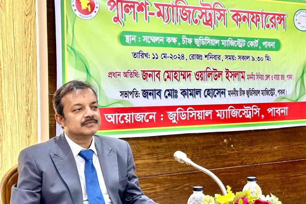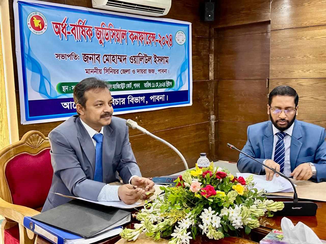 এস এম আলম, ১১ মে: পাবনা জজশীপ ও জুডিসিয়াল ম্যাজিস্ট্রেসিতে বিদ্যমান মামলাসমূহ দ্রুত নিষ্পত্তিতে প্রতিবন্ধকতাসমূহ দূরীকরণের উদ্দেশে ১১ মে, ২০২৪ খ্রি. তারিখে পাবনা জুডিসিয়াল ম্যাজিস্ট্রেসির সম্মেলনকক্ষে অর্ধ-বার্ষিকী জুডিসিয়াল কনফারেন্স-২০২৪ ও মাসিক পুলিশ-ম্যাজিস্ট্রেসি সম্মেলন অনুষ্ঠিত হয়। অর্ধ-বার্ষিকী জুডিসিয়াল কনফারেন্স-২০২৪ এর সভাপতিত্ব করেন মোহাম্মদ ওয়ালিউল ইসলাম, সিনিয়র জেলা ও দায়রা জজ, পাবনা এবং মাসিক পুলিশ-ম্যাজিস্ট্রেসি সম্মেলনের প্রধান অতিথি ছিলেন মোহাম্মদ ওয়ালিউল ইসলাম, সিনিয়র জেলা ও দায়রা জজ, পাবনা এবং সভাপতিত্ব করেন মোঃ কামাল হোসেন, চীফ জুডিসিয়াল ম্যাজিস্ট্রেট, পাবনা। উক্ত সম্মেলন সঞ্চালনা করেন যুগ্ম জেলা ও দায়রা জজ, ১ম আদালত, পাবনা এর যুগ্ম জেলা জজ মোঃ তাজউল ইসলাম। উক্ত সম্মেলনে উপস্থিত ছিলেন মোঃ আহসান তারেক, বিশেষ জজ (সিনিয়র জেলা জজ), মোহাম্মদ আবু ওবাইদা, অতিরিক্ত জেলা ও দায়রা জজ, মোঃ নূরুজ্জামান, অতিরিক্ত জেলা ও দায়রা জজ, তানবীর আহমেদ, অতিরিক্ত জেলা ও দায়রা জজ, মোঃ একরামুল কবির, যুগ্ম জেলা ও দায়রা জজ, ২য় আদালত, পাবনা, মোঃ জাহাঙ্গীর হোসেন, স্পেশাল ম্যাজিস্ট্রেট (যুগ্ম জেলা ও দায়রা জজ), বিদ্যুৎ আদালত, পাবনা, মোঃ আব্দুল্লাহ আল আমিন ভুঁইয়া, জজ (যুগ্ম জেলা ও দায়রা জজ), অর্থঋণ আদালত, পাবনা, মোঃ নাজমুল হোসেন, বিচারক (যুগ্ম জেলা ও দায়রা জজ), ল্যান্ড সার্ভে ট্রাইব্যুনাল, পাবনা, মোঃ মোরশেদুল আলম, অতিরিক্ত চীফ জুডিসিয়াল ম্যাজিস্ট্রেট, পাবনা, পারুল আক্তার, জেলা লিগ্যাল এইড অফিসার (সিনিয়র সহকারী জজ), পাবনা, মোঃ হাসান আল আজাদ, সিনিয়র জুডিসিয়াল ম্যাজিস্ট্রেট, পাবনা, ফারহানা হক ইয়ামীম, সিনিয়র জুডিসিয়াল ম্যাজিস্ট্রেট, পাবনা, সুমাইয়া সরকার, সিনিয়র জুডিসিয়াল ম্যাজিস্ট্রেট, পাবনা, মোঃ মুস্তাফিজুর রহমান, সিনিয়র জুডিসিয়াল ম্যাজিস্ট্রেট, পাবনা, মোঃ মোস্তফা কামাল, সহকারী জজ, পাবনা, সাদ্দাম হোসাইন, সহকারী জজ, পাবনা, জান্নাতুল আরা, সহকারী জজ, পাবনা, এসএম গিয়াস উদ্দিন, সহকারী জজ, পাবনা, মোঃ শহিদুল ইসলাম, সহকারী জজ, পাবনা, মোসাঃ শাম্মী আক্তার, সহকারী জজ, পাবনা, নওরিন জামান স্নিগ্ধা, সহকারী জজ, পাবনা, নাজমুল করিম, সহকারী জজ, পাবনা, আব্দুল্লাহ আল মামুন, অতিরিক্ত জেলা ম্যাজিস্ট্রেট, পাবনা, মোঃ ফজলে এলাহী, পুলিশ সুপার, পিবিআই, পাবনা, মোঃ মাসুদ আলম, অতিরিক্ত পুলিশ সুপার, পাবনা, ডা. মোঃ রফিকুল হাসান, সহকারী পরিচালক, পাবনা জেনারেল হাসপাতাল, পাবনা, মোঃ মাহবুবুর রহমান, সহকারী পুলিশ সুপার, সিআইডি, পাবনা, দেওয়ান মজনুল হক, সভাপতি, জেলা আইনজীবী সমিতি, পাবনা, আব্দুস সামাদ খান রতন, পিপি, পাবনা, মোঃ রওশন আলী, পাবনা সদর থানা, পাবনা, মোঃ জয়নাল আবেদীন, ভারপ্র