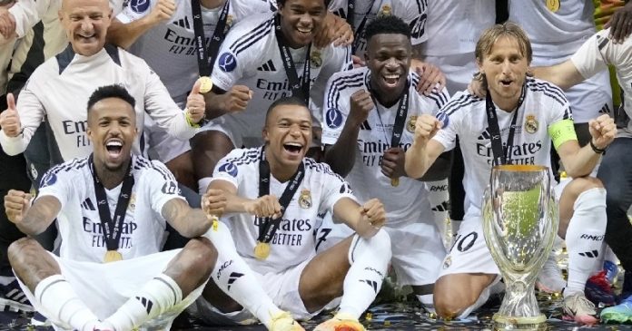 অবশেষে রিয়াল মাদ্রিদের জার্সিতে অভিষেক হলো কিলিয়ান এমবাপের। স্প্যানিশ লা লিগায় অভিষেক ম্যাচ রাঙাতে পেরেছেন ফ্রান্সের বিশ্বকাপজয়ী তারকা। দুর্দান্ত এক গোল করেছেন তিনি। এমবাপের অভিষেকের দিনে শিরোপার মুকুটে আরও একটি পালক যুক্ত করেছে রিয়াল। আটালান্টাকে ২-০ গোলে হারিয়ে সুপার কাপে শিরোপা জয়ের রেকর্ড করেছে লা লিগার ক্লাবটি। সুপার কাপ প্রতিযোগিতার ইতিহাসে সর্বোচ্চ ৬ বারের মতো শিরোপা জিতেছে রিয়াল।বুধবার (১৪ আগস্ট) পোল্যার্ডের ওয়ারশতে ৫৯ মিনিটে ক্লোজ রেঞ্জ থেকে গোল করে রিয়ালকে এগিয়ে দেন উরুগুয়ের তারকা ফেডেরিক ভালভার্দে। এর ৯ মিনিট পর জুড বেলিংহ্যামের পাস থেকে গোলবারের উপরের কোণা দিয়ে আটালান্টার জাল কাঁপান এমবাপে। এতে ২-০ গোলে এগিয়ে যায় রিয়াল।ম্যাচের ১৫ মিনিটেই রিয়ালের জার্সিতে প্রথম গোল পেতে যাচ্ছিলেন এমবাপে। তবে আটালান্টার রক্ষণভাগের বুনা জালে আটকা পড়েন সাবেক পিএসজি তারকা।