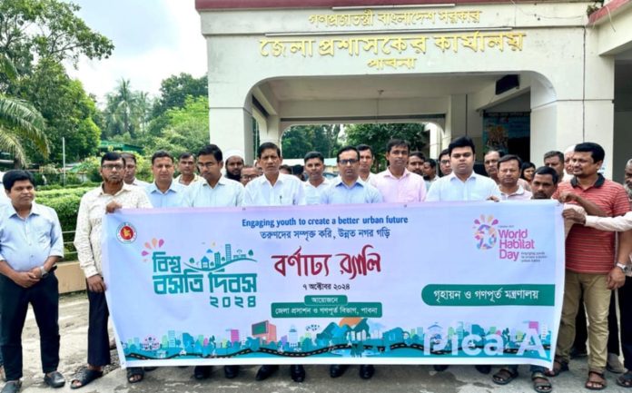 এস এম আলম, ৭ অক্টোবর: ’তরুণদের সম্পৃক্ত করি উন্নত নগর গড়ি’ – এ প্রতিপাদ্যে পাবনায় পালিত হয়েছে বিশ্ব বসতি দিবস। সকালে এ উপলক্ষে জেলা প্রশাসনের কার্যালয় থেকে একটি র্যালী বের হয়ে শহরের প্রধান প্রধান সড়ক প্রদক্ষিণ করে। পরে জেলা প্রশাসকের সম্মেলন কক্ষে এক আলোচনা সভায় প্রধান অতিথি ছিলেন জেলা প্রশাসক মোঃ মফিজুল ইসলাম। জেলা প্রশাসনের স্থানীয় সরকার বিভাগের উপ-পরিচালক শরীফ আহম্মেদের সভাপতিত্বে এ অনুষ্ঠানে বক্তব্য দেন গণপূর্ত বিভাগের নির্বাহী প্রকৌশলী মোঃ রাশেদ কবির, উপ-বিভাগীয় প্রকৌশলী মোঃ মিজানুর রহমান ও সহকারী প্রকৌশলী এস এম রায়হানুল ইসলাম। উপস্থিত ছিলেন পুলিশ সুপার মোরতোজা আলী খাঁন, অতিরিক্ত পুলিশ সুপার (প্রশাসন ও অপরাধ) কাজী শাহনেওয়াজ, উপ-বিভাগীয় প্রকৌশলী উজ্জ্বল হোসেন, উপ-সহকারী প্রকৌশলী মিরাজুল ইসলাম, উপ-সহকারী প্রকৌশলী জাহাঙ্গীর আলম, উপ-সহকারী প্রকৌশলী এফএম জাহিদুল ইসলাম, উপ-সহকারী প্রকৌশলী সিরাজুল ইসলাম, উপ-সহকারী প্রকৌশলী আরিফুল ইসলাম, উপ-সহকারী প্রকৌশলী দেলওয়ার হোসেন, উপ-সহকারী প্রকৌশলী মো: ইব্রাহিম সহ প্রিন্ট ইলেকট্রনিক্স মিডিয়ার সাংবাদিকবৃন্দ।
