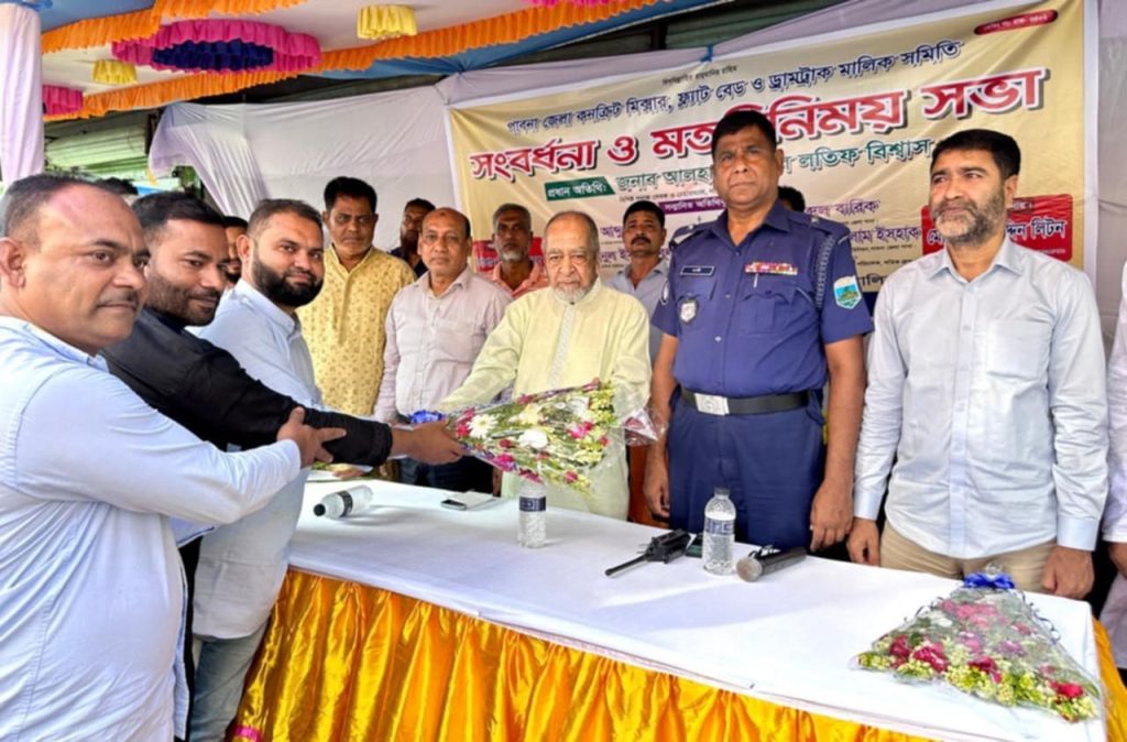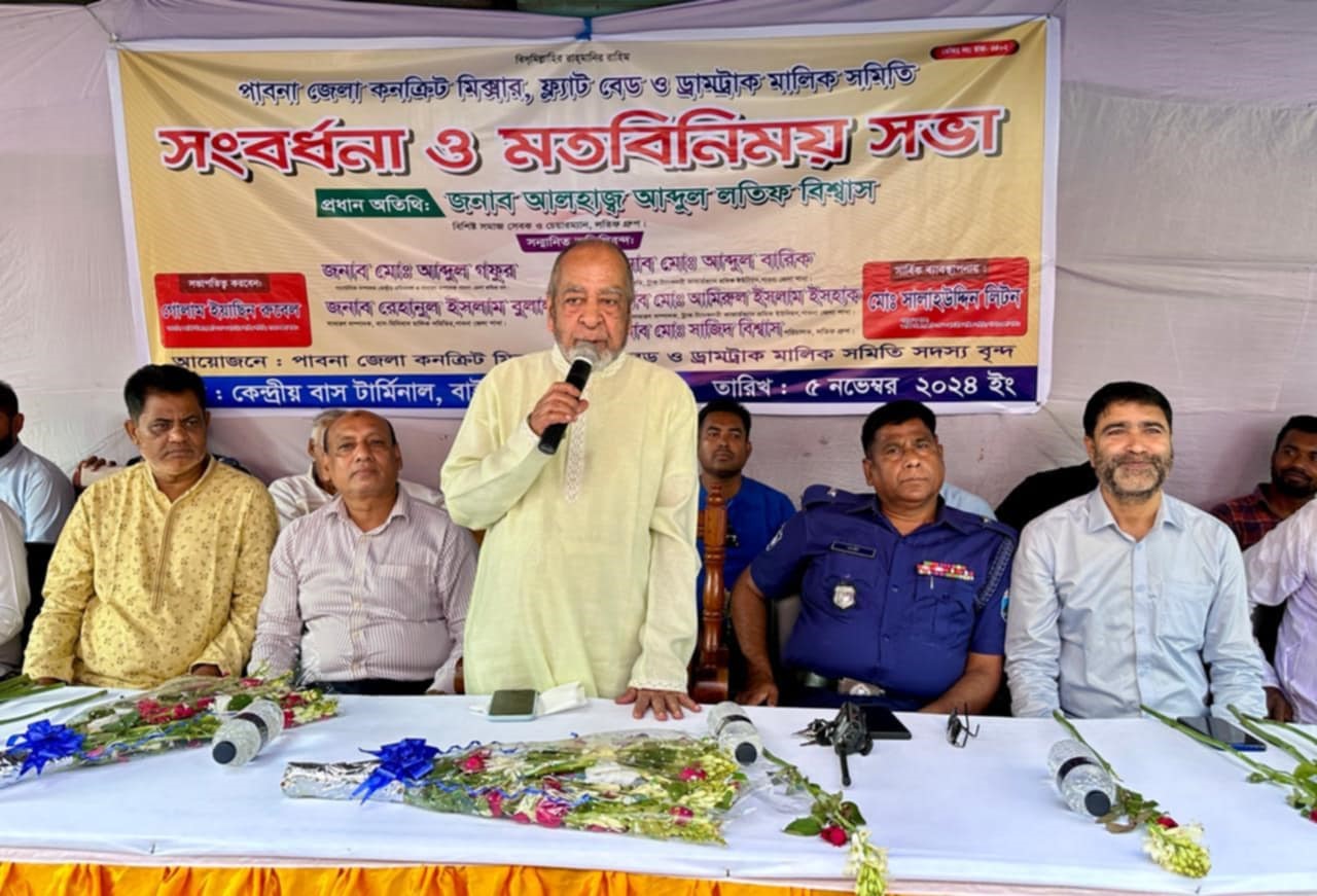 এস এম আলম, ৫ নভেম্বর: পাবনায় জেলা কংক্রিট মিকচার ফ্লাট বেড ও ড্রাম ট্রাঙ্ক মালিক সমিতির নবনির্বাচিত কমিটির সংবর্ধনা ও মতবিনিময় সভা অনুষ্ঠিত হয়েছে। সভায় প্রধান অতিথি ছিলেন লতিফ গ্রুপের চেয়ারম্যান আলহাজ্ব আব্দুল লতিফ বিশ্বাস। সমিতির সভাপতি গোলাম ইয়াসিন রুবেলের সভাপতিত্বে এর সভায় বক্তব্য দেন বাংলাদেশ জাতীয়তাবাদী শ্রমিক দলের পাবনা জেলা শাখার সাধারণ সম্পাদক মোঃ আব্দুল গফুর, জেলা বাস ও মিনিবাস মালিক সমিতির সাধারণ সম্পাদক রেহানুল ইসলাম বুলাল, জেলা ট্রাঙ্ক লরি ও কভার্ট ভ্যান শ্রমিক ইউনিয়নের সভাপতি মোঃ আব্দুল বারিক, সাধারণ সম্পাদক মোঃ আমিরুল ইসলাম ইসহাক, লতিফ গ্রুপের পরিচালক সাজিদ বিশ্বাস, ট্রাফিক পরিদর্শক সাদাকাতুল বারী, ট্রাফিক পরিদর্শক মিনহাজ, কংক্রিট মিকচার ফ্লাট বেড ও ড্রাম ট্রাঙ্ক মালিক সমিতির সাধারণ সম্পাদক সালাহউদ্দিন লিটন।