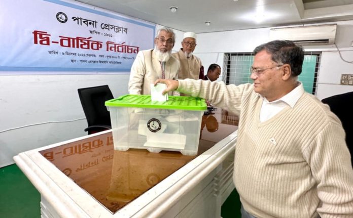 এস এম আলম, ৭ ডিসেম্বর: পাবনা প্রেস ক্লাবের দ্বি-বার্ষিক নির্বাচনে দৈনিক যুগান্তর ও চ্যানেল আই এর জেলা প্রতিনিধি আখতারুজ্জামান আখতার সভাপতি এবং দৈনিক আমার দেশ পত্রিকার জেলা প্রতিনিধি জহুরুল ইসলাম সম্পাদক নির্বাচিত হয়েছেন। শুক্রবার বিকেল ৩টা থেকে সন্ধ্যা ৬টা পর্যন্ত প্রেসক্লাব মিলনায়তনে ভোটগ্রহণ অনুষ্ঠিত হয়। শান্তিপূর্ণ ও উৎসবমুখর পরিবেশে ভোটাররা তাদের ভোটাধিকার প্রয়োগ করেন। পরে গণনা শেষে রাত ৯ টায় ফলাফল ঘোষণা করা হয়। নির্বাচনে অন্যান্য পদে বিজয়ীরা হলেন, সহ সভাপতি জেলা প্রতিনিধি দৈনিক ইছামতি ছিফাত রহমান সনম ও জেলা প্রতিনিধি নয়া দিগন্ত এস এম আলাউদ্দিন, যুগ্ম-সম্পাদক পদে জেলা প্রতিনিধি দৈনিক ইছামতি মোখলেছুর রহমান খান বিপ্লব, অর্থ সম্পাদক পদে জেলা প্রতিনিধি আরটিভি আবুল কালাম আজাদ, ক্রীড়া সম্পাদক পদে ইমরোজ খন্দকার বাপ্পী (জিটিভি), কল্যাণ সম্পাদক পদে জেলা প্রতিনিধি যমুনা টেলিভিশন কলিট তালুকদার। নির্বাহী সদস্য পদে জেলা প্রতিনিধি আজকের ইতিহাস আবু হাসনা মুহাম্মদ আইয়ুব, জেলা প্রতিনিধি বাসস রফিকুল ইসলাম সুইট, জেলা প্রতিনিধি চ্যানেল ২৪ ও আজকের পত্রিকা শাহীন রহমান, জিকে সাদী, জেলা প্রতিনিধি যায়যায়দিন আরিফ আহমেদ সিদ্দিকী, সুশীল কুমার তরফদার ও জেলা প্রতিনিধি বৈশাখী টেলিভিশন মিজানুর রহমান। মোট ৬২ ভোটারের মধ্যে ৫৭ জন ভোটার তাদের ভোটাধিকার প্রয়োগ করেন। প্রধান নির্বাচন কমিশনারের দায়িত্ব পালন করেন অ্যাডভোকেট মির্জা আজিজুর রহমান। নির্বাচন কমিশনার ছিলেন অ্যাডভোকেট শাজাহান আলী, অধ্যাপক জহুরুল ইসলাম, অধ্যাপক রুহুল আমিন। নব নির্বাচিত সভাপতি আখতারুজ্জামান আখতার ও সম্পাদক জহুরুল ইসলাম জানান, ’উৎসবমুখর পরিবেশে প্রেসক্লাবের ভোট সম্পন্ন হয়েছে। পাবনার সাংবাদিকদের অধিকার আদায়ে কাজ করব ইনশাআল্লাহ’।