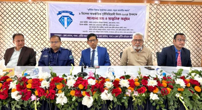 এস এম আলম, ৯ ডিসেম্বর: পাবনায় আন্তর্জাতিক দুর্নীতি বিরোধী দিবস পালিত হয়েছে। “উন্নয়ন, শান্তি ও নিরাপত্তার লক্ষ্যে দুর্নীতির বিরুদ্ধে আমরা ঐক্যবদ্ধ” এই প্রতিপাদ্যে সকালে পাবনা জেলা প্রশাসন, দুর্নীতি দমন কমিশন সমন্বিত জেলা কার্যালয়, পাবনা ও জেলা দুর্নীতি প্রতিরোধ কমিটির উদ্যোগে যথাযোগ্য মর্যাদায় আন্তর্জাতিক দুর্নীতি বিরোধী দিবস,আলোচনা সভা ও সাংস্কৃতিক অনুষ্ঠান পালন করা হয়। দিবস উপলক্ষ্যে পাবনা জেলা প্রশাসন চত্বরে জাতীয় সংগীতের সাথে জাতীয় পতাকা ও দুদকের পতাকা উত্তোলন ও বেলুন উড়িয়ে অনুষ্ঠানের শুভ উদ্বোধন করা হয়। পরে মানববন্ধন শেষে পাবনা পুলিশ লাইন্স শহীদ বীর মুক্তিযোদ্ধা এএসআই আব্দুল জলিল মিলন মিলনায়তনে আলোচনা সভা ও সাংস্কৃতিক অনুষ্ঠানের মধ্য দিয়ে দিবসটি সমাপ্ত হয়। অনুষ্ঠানে উপস্থিত ছিলেন পাবনা জেলা প্রশাসক মোহাম্মদ মফিজুল ইসলাম, পুলিশ সুপার মোঃ মুর্তজা আলী খান, জেলা দুর্নীতি প্রতিরোধ কমিটির সভাপতি মোর্তজা আলী খান ও সাধারণ সম্পাদক এবিএম ফজলুর রহমান। অনুষ্ঠানে সভাপতিত্ব করেন পাবনা জেলা কার্যালয়ের দুর্নীতি দমনের উপ-পরিচালক শহিদুল আলম সরকার, পাবনা প্রেসক্লাবের নবনির্বাচিত সভাপতি আখতারুজ্জামান আক্তার সহ বিশিষ্টজন।