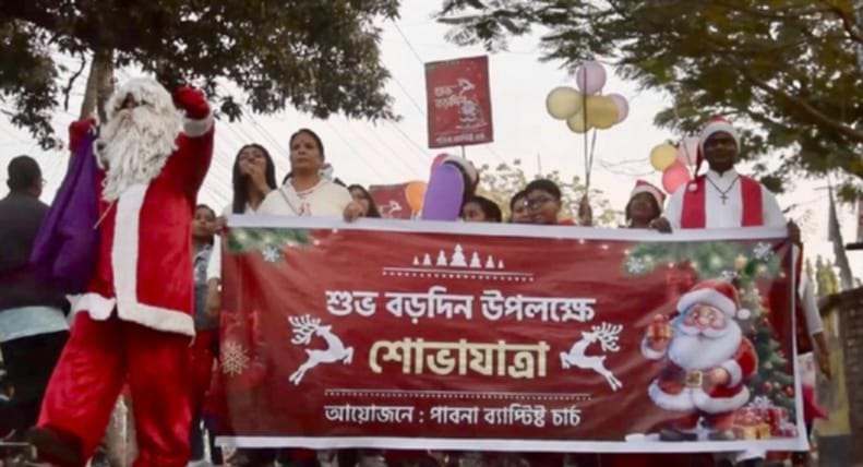 এস এম আলম, ২১ ডিসেম্বর: আগামী ২৫ ডিসেম্বর শুভ বড়দিন উপলক্ষে পাবনায় আনন্দ শোভাযাত্রা অনুষ্ঠিত হয়েছে। বিকালে পাবনা শহরের ব্যাপ্টিষ্ট চার্চ প্রাঙ্গন থেকে শোভাযাত্রটি বেড় হয়ে শহরের বিভিন্ন সড়ক ঘুড়ে আবার ব্যাপ্টিষ্ট চার্চ প্রাঙ্গনে গিয়ে শেষ হয়। শোভাযাত্রা থেকে বড়দিনের মূল আকর্ষণ সান্তাক্লজ শিশুদের হাতে বড়দিনের উপহার হিসাবে চকলেট বিতরন করেন।