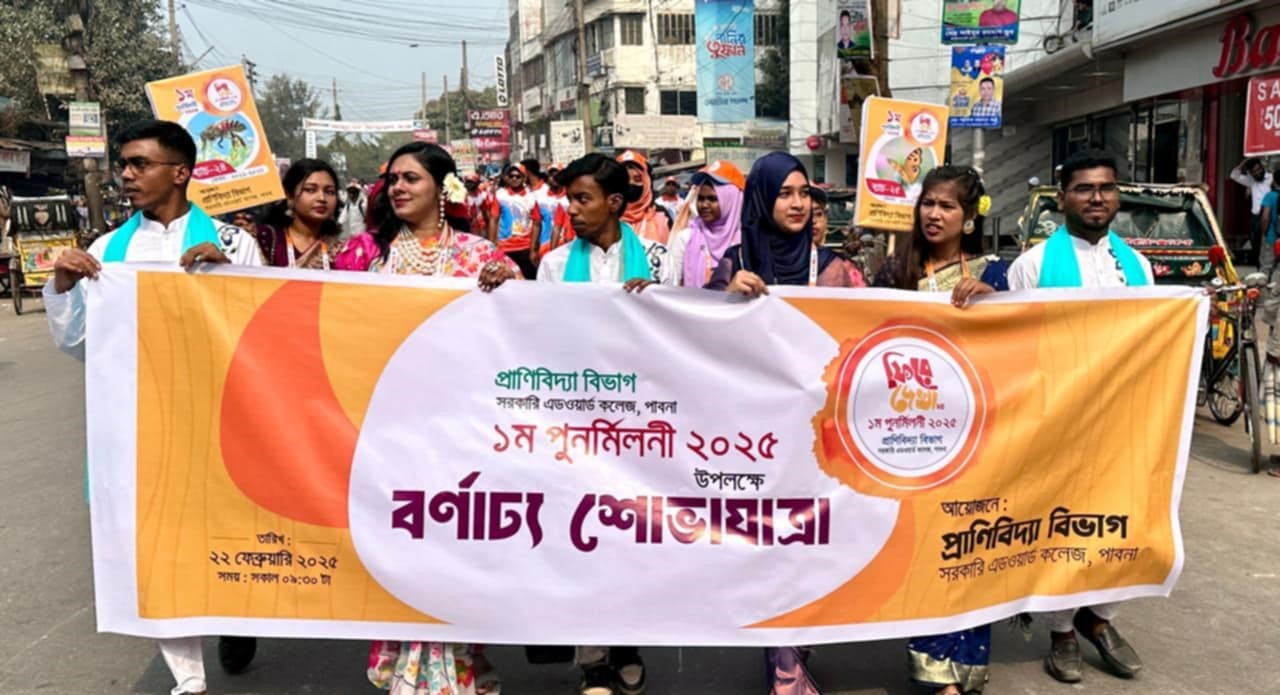 এস এম আলম, ২২ ফেব্রুয়ারি: পাবনা সরকারি এডওয়ার্ড কলেজের প্রাণিবিদ্যা বিভাগের প্রথম পুনর্মিলনী অনুষ্ঠান অনুষ্ঠিত হয়েছে। এ উপলক্ষে বর্ণাঢ্য শোভাযাত্রা বের হয়ে শহরের প্রধান প্রধান সড়ক প্রদক্ষিণ করে ও কলেজ প্রাঙ্গনে এসে শেষ হয়। পরে সারাদিন ব্যাপী আলোচনা সভা ও সাংস্কৃতিক অনুষ্ঠান অনুষ্ঠিত হয়।