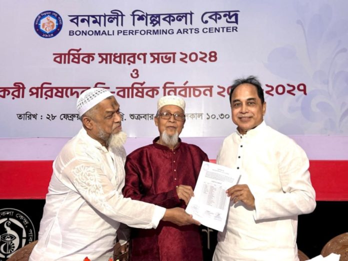 এস এম আলম, ২৮ ফেব্রুয়ারি: পাবনায় বনমালী শিল্পকলা কেন্দ্র এর বার্ষিক সাধারণ সভা ও কার্যকরী পরিষদের ত্রি-বার্ষিক নির্বাচন অনুষ্ঠিত হয়েছে। সকালে বনমালী শিল্পকলার হলরুমে ত্রি-বার্ষিক নির্বাচন ও সাধারণ সভা অনুষ্ঠিত হয়। বনমালী শিল্পকলা কেন্দ্রে’র কার্যকরী পরিষদের ত্রি-বার্ষিক নির্বাচন (২০২৫-২০২৭) সম্পন্ন করার লক্ষ্যে ঘোষিত তফশিল অনুযায়ী ২০ ফেব্রুয়ারি ২০২৫ তারিখে একটি প্যানেল মনোনয়নপত্র দাখিল করেন। মনোনয়নপত্র যাচাই-বাছাই শেষে বৈধ প্রার্থী তালিকা প্রকাশ করা হয়। নির্ধারিত সময়ের মধ্যে মনোনয়নপত্র প্রত্যাহার না করায় চূড়ান্ত প্রার্থী তালিকা প্রকাশ করা হয়। চুড়ান্ত তালিকা পর্যালোচনায় দেখা যায় যে, বনমালী শিল্পকলা কেন্দ্র এর গঠনতন্ত্র অনুযায়ী নির্ধারিত পদের বিপরীতে অতিরিক্ত প্রতিদ্বন্দ্বী প্রার্থী না থাকায় নিম্নলিখিত প্রার্থীগণকে বিনা প্রতিদ্বন্দ্বিতায় নির্বাচিত ঘোষণা করা হয়। কোন প্রতিদ্বন্দ্বিতায় না থাকায় সভাপতি অঞ্জন চৌধুরী পিন্টু, সাধারণ সম্পাদক ড. হাবিবুল্লাহ, সহ-সভাপতি অ্যাডভোকেট সনৎ কুমার সরকার ও আলহাজ ডা. মনোয়ার উল আজীজ, যুগ্ম সাধারণ সম্পাদক (প্রশাসন) রবিউল ইসলাম চৌবে ডাবলু, যুগ্ম সাধারণ সম্পাদক (সাংস্কৃতিক) প্রলয় চাকী টুকাই, অর্থ সম্পাদক মোসাদ্দেক আলী খান খসরু, কার্যনির্বাহী সদস্য এড. মোহাম্মদ আব্দুল হান্নান, এড. আব্দুল হান্নান শেলী, মিসেস সোহানি হোসেন, হাবিবুর রহমান হাবিব, আলী হাসনাত বক্তার, সাইফুল আলম স্বপন চৌধুরী, এড. মোসফেকা জাহান কণিকা, আখতারুজ্জামান আক্তার, আবুল কাশেম, এড. নাজমুল হোসেন শাহীন নির্বাচিত হয়। ১৭ সদস্য নিয়ে এবারে কমিটি গঠন হয়েছে। নির্বাচন পরিচালনা করেন বনমালী শিল্পকলা কেন্দ্রের কার্যকরী পরিষদের নির্বাচন কমিশনার এড. মির্জা আজিজুর রহমান, বনমালী শিল্পকলা কেন্দ্রের কার্যকরী পরিষদ নির্বাচন কমিশনের সদস্য এড. কাজী সাইদুর রহমান, বনমালী শিল্পকলা কেন্দ্রের কার্যকরী পরিষদ নির্বাচন কমিশনের সদস্য জহুরুল ইসলাম।