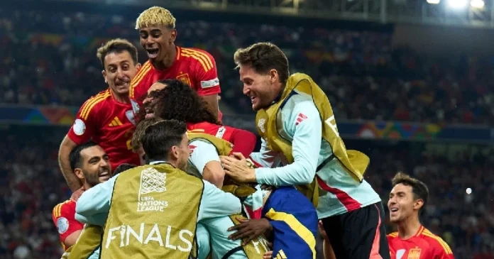 ফরাসিদের বিদায় করে উয়েফা নেশন্স লিগের ফাইনালে উঠে গেছে স্পেন। যেখানে তাদের জন্য আগে থেকেই অপেক্ষায় রয়েছে ক্রিশ্চিয়ানো রোনালদোর পর্তুগাল। যারা জার্মানিকে হারিয়ে উঠেছে ফাইনালে। এ নিয়ে টানা তৃতীয়বার নেশন্স লিগের ফাইনালে উঠলো স্প্যানিশরা।পুরো ম্যাচের আলো কেড়ে নিয়েছেন একজন। তরুণ তারকা লামিনে ইয়ামাল। জোড়া গোল করেছেন তিনি। মূলত, তার এই জোড়া গোলেই নেশন্স লিগের ফাইনালের দেখা পেয়েছে স্প্যানিশরা। সে সঙ্গে ব্যালন ডি’অর লড়াইয়ে নতুন মাত্রা যোগ করলেন তিনি।গত সপ্তাহে মিউনিখে ইন্টারমিলানকে হারিয়ে উয়েফা চ্যাম্পিয়ন্স লিগ জেতা পিএসজি ফুটবলার উসমান ডেম্বেলে এবং ডেজিরে দুয়ে ব্যালন ডি’অরের অনেক বড় দুই দাবিদার। সেই তাদের দল ফ্রান্সের বিপক্ষে অসাধারণ পারফরম্যান্স দেখিয়ে ব্যালন ডি’অরের প্রবল প্রতিদ্বন্দ্বী হয়ে উঠেছেন লামিনে ইয়ামাল। মূলত এই ম্যাচটি শুধু নেশন্স লিগের ফাইনালে ওঠার লড়াই ছিল না। ছিল দুই তরুণ ফুটবলারের ব্যালন ডি’অর জয়ের লড়াইয়ের গল্পও।জার্মানির স্টুর্টগার্টে এমএইচপি এরেনায় প্রথমার্ধেই ২-০ গোলে এগিয়ে গিয়েছিল স্পেন। দ্বিতীয়ার্ধে হলো মোট ৭ গোল। স্পেনের তিনটি এবং ফ্রান্সের চারটি। ২২তম মিনিটে গোলের সূচনা করেন নিকো উইলিয়ামস। ২৫তম মিনিটে দ্বিতীয় গোল করে বসেন মাইকেল মেরিনো।