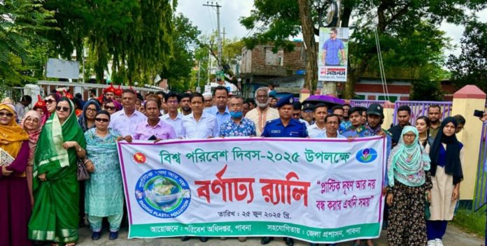 এস এম আলম, ২৫ জুন: প্লাস্টিক দূষন আর নয়, বন্ধ করার এখনই সময় এই প্রতিপাদ্য সারা দেশের ন্যায় পাবনাতে নানা আয়োজনে বিশ্ব পরিবেশ দিবস পালিত হয়েছে। এ উপলক্ষ্যে সকালে জেলা প্রশাসকের সামনে থেকে একটি শোভাযাত্রা বেড় হয়ে শহরের বিভিন্ন সড়ক প্রদক্ষিন শেষে জেলা শিল্পকলা একাডেমির সামনে গিয়ে শেষ হয়। পরে শিল্পকলা একাডেমি হল রুমে সংক্ষিপ্ত আলোচনা হয়। এসময় উপস্থিত ছিলেন জেলা প্রশাসক মফিজুল ইসলাম, সিভিল সার্জন ডা: মো: আবুল কালাম আজাদ, পরিবেশ অধিদপ্তর পাবনা জেলা কার্যালয়ের সহকারী পরিচালক আব্দুল গফুর, অতিরিক্ত জেলা প্রশাসক সারবিক জাহাঙ্গীর আলম, অতিরিক্ত জেলা ম্যাজিস্ট্রেট উম্মে তাবাসসুম, সিভিল সার্জন আব্দুল করিম, অতিরিক্ত পুলিশ সুপার মুহাম্মদ শরিফুল ইসলাম, উপ-পরিচালক এনএসআই মো: তৌফিক ইকিবাল, স্কয়ার ফার্মাসিউটিক্যালস পি এল সি এর কারখানা প্রধান মোঃ খায়রুল আলম, স্কয়ার ফার্মাসিউটিক্যালস পি এল সি এর সহকারী মহা-ব্যবস্থাপক মোঃ তানজিরুল ইসলাম, স্কয়ার ফুড অ্যান্ড বেভারেজ লিমিটেডের সহকারী ব্যবস্থাপক সরকার শিবলী শরিফ, স্কয়ার ফার্মাসিউটিক্যালস পি এল সি এর নির্বাহী আলীশান ঈমাম, স্কয়ার টয়লেট্রিজ লিমিটেডের অফিসার-মানব সম্পদ আরাফাত বাবর, পাবনা প্রেসক্লাবের সাধারণ সম্পাদক জহুরুল ইসলাম সহ বিভিন্ন সরকারী দপ্তরের কর্মকর্তা-কর্মচারী, শিল্প উদ্যোক্তা, এনজিও কর্মী, রাজনৈতিক ব্যক্তি, সাংবাদিক, বিভিন্ন শিক্ষা প্রতিষ্ঠানের শিক্ষক ও ছাত্র-ছাত্রীবৃন্দ। অনুষ্ঠানে প্রবন্ধ উপস্থাপন করেন পাবনা বিজ্ঞান ও প্রযুক্তি বিশ্ববিদ্যালয়ের জীব ও ভু-বিজ্ঞান অনুষদের ডীন ড. মোঃ নাজমুল ইসলাম।
