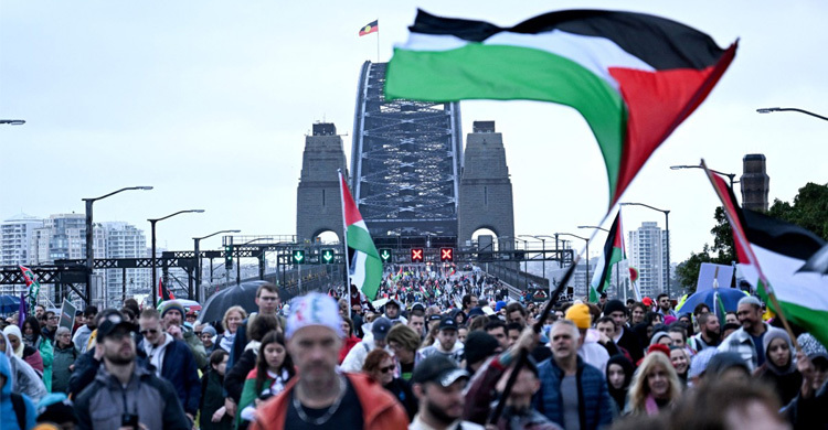 সিডনির ঐতিহাসিক হারবার ব্রিজে রোববার (৩ আগস্ট) ফিলিস্তিনের সমর্থনে এক শান্তিপূর্ণ বিক্ষোভে অংশ নিয়েছেন ৯০ হাজারের বেশি মানুষ। ‘মার্চ ফর হিউম্যানিটি’ শীর্ষক এই সমাবেশটি শনিবার রাতেই নিউ সাউথ ওয়েলস সুপ্রিম কোর্টের অনুমোদন পায়। আয়োজকরা একে ‘ঐতিহাসিক রায়’ হিসেবে উল্লেখ করেন।এদিন প্রবল বৃষ্টিকে উপেক্ষা করেই হাজার হাজার মানুষ ফিলিস্তিনের পক্ষে এবং গাজায় যুদ্ধবিরতির দাবিতে রাস্তায় নেমে আসেন। উইকিলিকসের প্রতিষ্ঠাতা জুলিয়ান অ্যাসাঞ্জ, ফেডারেল এমপি এড হুসিক এবং নিউ সাউথ ওয়েলসের সাবেক প্রিমিয়ার বব কারসহ অনেক বিশিষ্টজনও মিছিলে অংশ নেন।বিক্ষোভে অংশ নেওয়া মানুষদের হাতে ছিল যুদ্ধ বন্ধের আহ্বান জানানো নানা প্ল্যাকার্ড। এসময় স্লোগানে মুখরিত হয়ে ওঠে সিডনি হারবার ব্রিজ, এর মধ্যে ছিল ‘শেইম শেইম ইসরায়েল, শেইম শেইম ইউএসএ’, ‘যুদ্ধবিরতি চাই – এখনই চাই’, ইত্যাদি।অনেকেই পরিবার ও ছোট সন্তানদের নিয়ে মিছিলে যোগ দেন। তিন বছরের ছেলেকে নিয়ে অংশ নেওয়া অ্যালে বেভিল বলেন, এটি হয়তো আমাদের দেশ থেকে অনেক দূরে, কিন্তু এর প্রভাব আমাদের জীবনেও পড়ে।শিশু কোলে মিছিলে আসা জারা উইলিয়ামস বলেন, আমাদের সরকার ইসরায়েলের বিরুদ্ধে কোনো কার্যকর নিষেধাজ্ঞা দেয়নি। গোটা একটি জনগোষ্ঠীর ওপর জোরপূর্বক অনাহার চাপিয়ে দেওয়া হচ্ছে—এটা মেনে নেওয়া যায় না।প্রথমে অনুমতি না দিলেও শেষ পর্যন্ত আদালতের আদেশে হারবার ব্রিজ যান চলাচলের জন্য বন্ধ করে দেওয়া হয় এবং বিক্ষোভকারীদের নিরাপত্তা প্রদান করা হয়।তবে দুই ঘণ্টা পর নিউ সাউথ ওয়েলস পুলিশ সবাইকে এসএমএস করে মিছিল বন্ধ করার আহ্বান জানায়। বার্তায় বলা হয়, জননিরাপত্তা রক্ষার জন্য শহরের দিকে ফিরে যান এবং শান্তিপূর্ণভাবে অবস্থান করুন।এ বিষয়ে পুলিশের ভারপ্রাপ্ত ডেপুটি কমিশনার পিটার ম্যাককেনা বলেন, আমরা ভয় পেয়েছিলাম যে এত বড় ভিড়ে ক্রাউড ক্রাশ বা পদদলিত হওয়ার ঘটনা ঘটতে পারে। আয়োজকরা যেখানে ৫০ হাজারের উপস্থিতি আশা করছিলেন, বাস্তবে উপস্থিত হন প্রায় ৯০ হাজার।