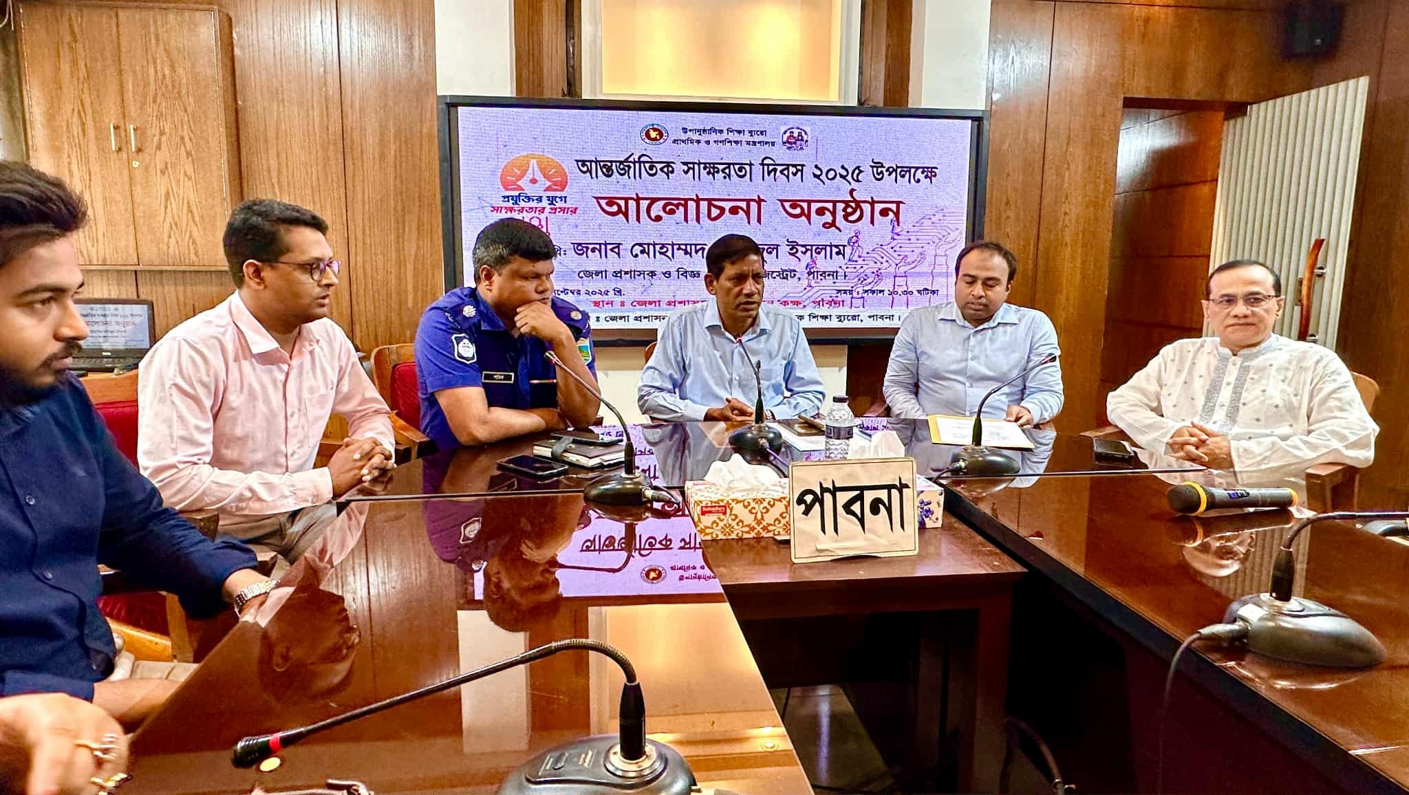 এস এম আলম, ৮ সেপ্টেম্বর: প্রযুক্তির যুগে সাক্ষরতার প্রসার এই প্রতিপাদ্যকে সামনে রেখে পাবনায় আন্তর্জাতিক সাক্ষরতা দিবস উপলক্ষে আলোচনা সভা অনুষ্ঠিত হয়েছে। সকালে জেলা প্রশাসকের কার্যালয়ের হলরুমে জেলা প্রশাসন ও জেলা উপানুষ্ঠানিক শিক্ষা ব্যুরোর আয়োজনে দিবসটি পালন করা হয়। এসময় প্রধান অতিথি হিসেবে উপস্থিত ছিলেন জেলা প্রশাসক মোহাম্মদ মফিজুল ইসলাম। অতিরিক্ত জেলা প্রশাসক মনিরুজ্জামানের সভাপতিত্বে আরো উপস্থিত ছিলেন অতিরিক্ত পুলিশ সুপার শরিফুল ইসলাম, প্রেসক্লাবের সভাপতি আখতারুজ্জামান আক্তার,জেলা উপানুষ্ঠানিক শিক্ষা ব্যুরোর সহকারী পরিচালক রনি আহম্মেদ, সরকারি বালিকা উচ্চ বিদ্যালয় প্রধান শিক্ষক আবু সাইদ মিয়া, জুলাই যোদ্ধা মাহফুজুর রহমান, নির্বাহী পরিচালক দিগন্ত পাবনা শামছুননাহার মুক্তা, জেলা শিক্ষা অফিসার, জেলা প্রাথমিক শিক্ষা অফিসার সহ গন্যমান্য ব্যক্তিবর্গ।