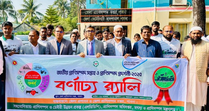এস এম আলম, ২৬ নভেম্বর: “দেশীয় জাত, আধুনিক প্রযুক্তি : প্রাণি সম্পদে হবে উন্নতি,”- এ প্রতিপাদ্যে পাবনায় অনুষ্ঠিত হয়েছে জাতীয় প্রাণিসম্পদ সপ্তাহ ও প্রাণি সম্পদ মেলা। দুপুরে জেলা প্রাণি সম্পদ কার্যালয় থেকে জেলা প্রশাসক শাহেদ মোস্তফার নেতৃত্বে একটি শোভাযাত্রা বের হয়ে গ্রিনলিফ কিন্ডার গার্টেন স্কুল চত্বরে গিয়ে শেষ হয়। প্রানীসম্পদ মেলার উদ্বোধনী অনুষ্ঠানে জেলা প্রাণিসম্পদ অফিসার মোঃ জহুরুল ইসলামের সভাপতিত্বে প্রধান অতিথির বক্তব্য দেন জেলা প্রশাসক শাহেদ মোস্তফা। স্বাগত বক্তব্য দেন উপজেলা প্রানীসম্পদ কর্মকর্তা ড. আব্দুল কাদের। বক্তব্য দেন অতিরিক্ত পুলিশ সুপার রেজিনুর রহমান, জেলা মৎস্য কর্মকর্তা দীপক কুমার পাল, উপজেলা নির্বাহী কর্মকর্তা মেহেদী হাসান, অতিরিক্ত উপপরিচালক কৃষি সম্প্রসারণ অধিদপ্তর রবিউল ইসলাম। অনুষ্ঠান সঞ্চালনা করেন ভেটেরিনারি সার্জন ড. মো: ওয়ালিউল হোসেন। মেলায় গবাদি পশু প্রদর্শন, হাঁস মুরগির ফ্রি ভ্যাকসিনেশন ক্যাম্পেইন ও কৃমিনাশক বিতরণ করা হয়।