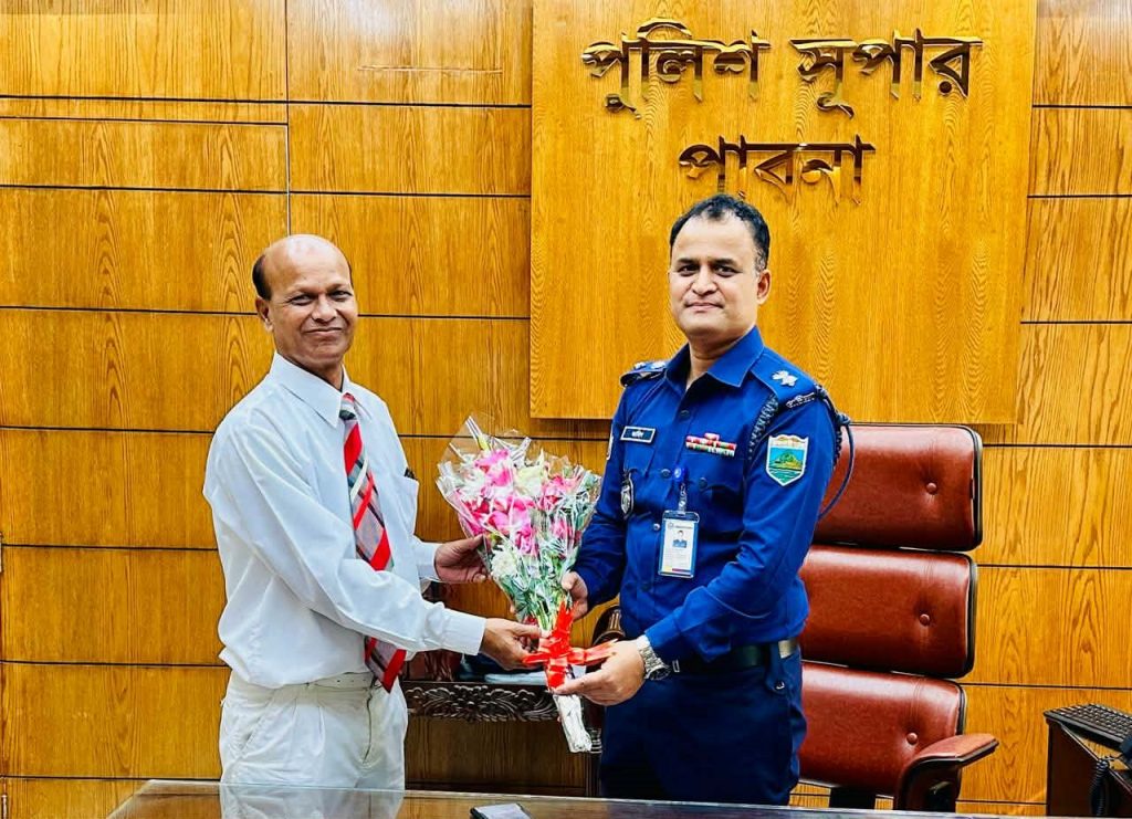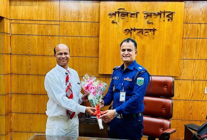 এস এম আলম, ৩০ নভেম্বরঃ পাবনা জেলার নবাগত পুলিশ সুপার মোঃ আনোয়ার জাহিদ কে ফুলের শুভেচ্ছা দেন নতুন চোখ পত্রিকার প্রকাশক ও বাংলা টেলিভিশনের জেলা প্রতিনিধি এস এম আলম।