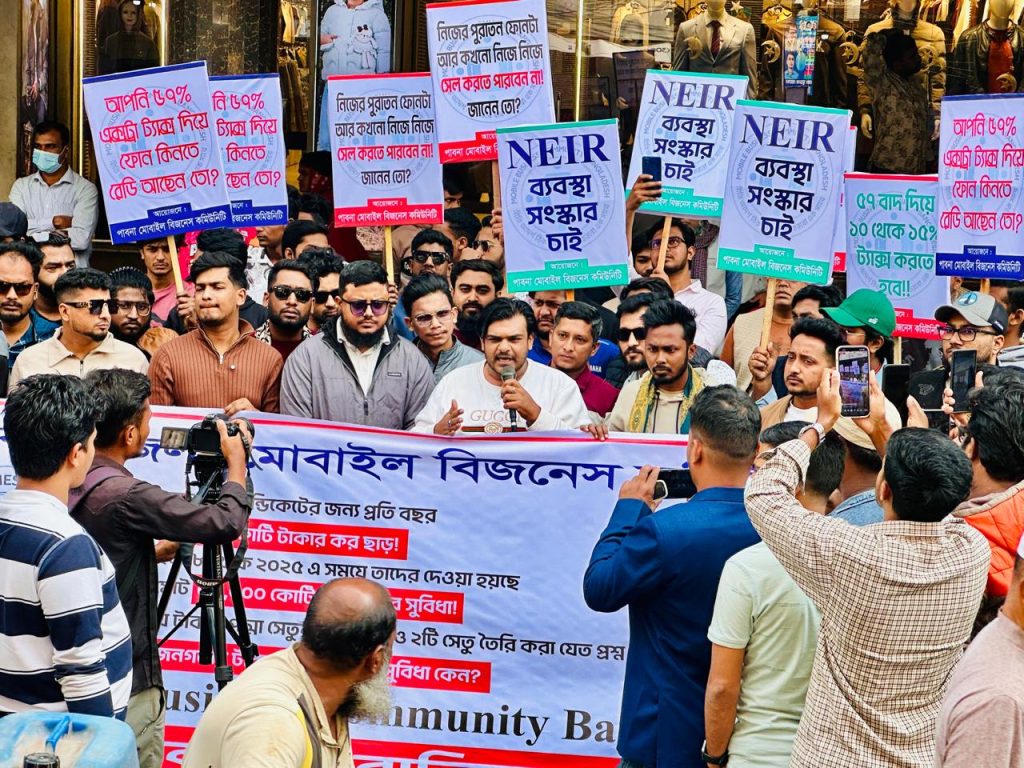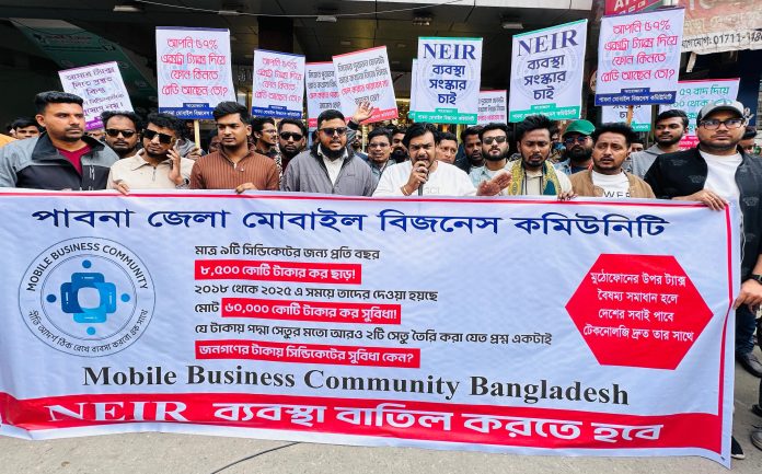 এস এম আলম, ৮ ডিসেম্বর: আব্দুল হামিদ রোডস্থ পাবনা প্রেসক্লাবের সামনে পাবনা জেলা মোবাইল বিজনেস কমিউনিটি এর উদ্যোগে মোবাইল ফোনের উপর ৫৭% ট্যাক্স বাদ দিয়ে ১০% থেকে ১৫% ট্যাক্স করা’সহ NEIR ব্যবস্থা সংস্কার এর দাবিতে বিক্ষোভ কর্মসূচি পালন করেন। উক্ত বিক্ষোভ কর্মসূচিতে মোবাইল ব্যবসায়ী মোঃ ভুবন হোসেন, মোঃ মেহেদী হাসান, মোঃ রন্টি আহমেদ এবং মোঃ তানভীর হোসেন এর নেতৃত্বে মোবাইল ব্যাবসায়ী মোঃ তালহা, মোঃ রিজভী হাসান, মোঃ আল-আমিন হোসেন, মোঃ হাবিবুর রহমান, প্রান্ত ইসলাম, মোঃ রাজু আহমেদ, মোঃ মানিক মিয়া’সহ পাবনা জেলা মোবাইল বিজনেস কমিউনিটি এর সদস্যবৃন্দ আনুমানিক ১০০/১২০ জন উপস্থিত ছিলেন। বিক্ষোভ কর্মসূচিতে অংশগ্রহণকারীরা বলেন, অবিলম্বে মোবাইল ফোনের উপর NEIR পদ্ধতি সংস্কার এবং মোবাইলের উপর অতিরিক্ত ভ্যাট ট্যাক্স কমানো না হলে কঠোর কর্মসূচি দিতে বাধ্য হব।