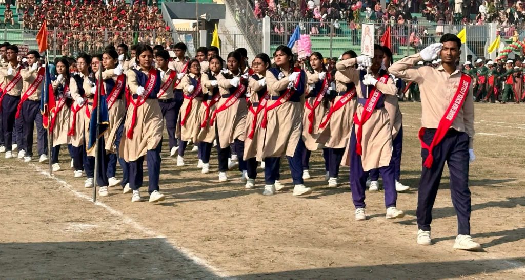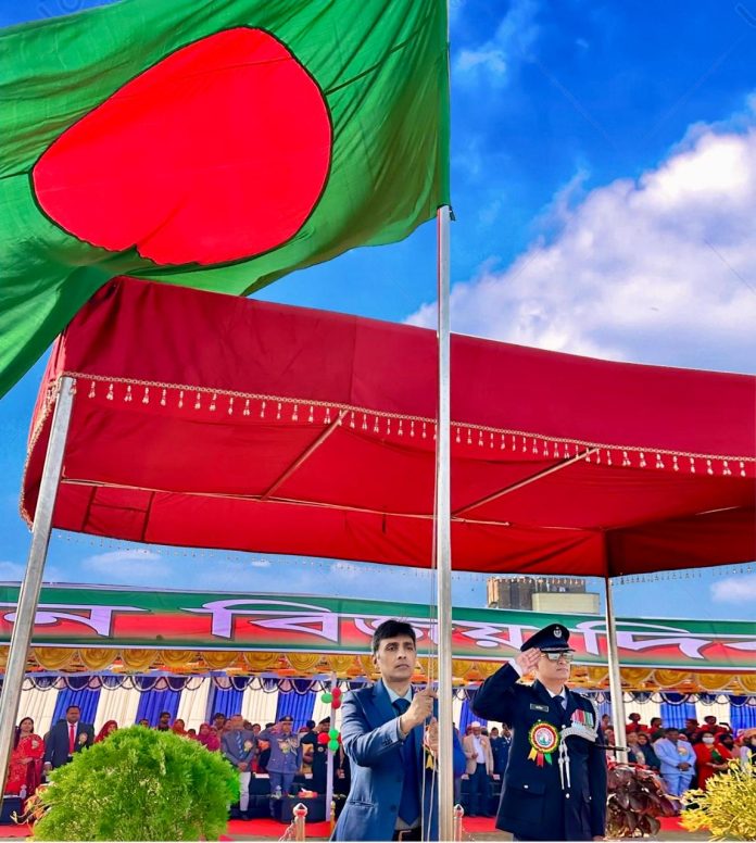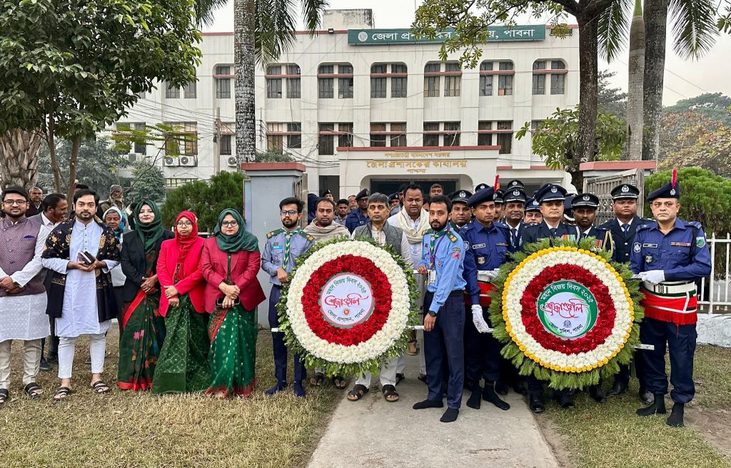 এস এম আলম, ১৬ ডিসেম্বর: যথাযোগ্য মর্যাদায় বিভিন্ন কর্মসূচির মধ্যদিয়ে পাবনায় মহান বিজয় দিবস পালিত হয়েছে। সরকারী-বেসরকারী অফিস-প্রতিষ্ঠান, শিক্ষা প্রতিষ্ঠান, রাজনৈতিকদল, সামাজিক, সাংস্কৃতিক সংগঠন দিবসটি পালন করে। কর্মসূচির মধ্যে ছিলো পু®পস্তবক অর্পণ, মুক্তিযোদ্ধাদের সংবর্ধনা, হাতের লেখা ও রচনা এবং চিত্রাংকন প্রতিযোগীতা, শোভাযাত্রা, আলোকসজ্জা, আলোচনা সভা। দিবসের প্রথম প্রহর ও প্রত্যুষে মুক্তিযুদ্ধের স্মৃতিস্তম্ভ দুর্জয় পাবনায় পুষ্পস্তবক অর্পণ করেন জেলা প্রশাসক শাহেদ মোস্তফা ও পুলিশ সুপার আনোয়ার জাহিদ, নিভিল সার্জন ডা: আবুল কালাম আজাদ, পাবনা প্রেসক্লাব সহ বিভিন্ন শিক্ষা প্রতিষ্ঠান, সামাজিক, সাংস্কৃতিক, পেশাজীবি ও রাজনৈতিক সংগঠন। এসময় স্মৃতিস্তম্ভে নানা পেশাজীবি মানুষ মহান মুক্তিযুদ্ধের জীবন উৎসর্গকারী শহীদদের স্মরণে দাাঁড়িয়ে এক মিনিট নিরবতা পালন করেন। এছাড়া জেলা শহীদ আমিন উদ্দিন স্টেডিয়ামে কুচকাওয়াজে পতাকা উত্তোলন ও সালাম গ্রহণ করেন জেলা প্রশাসক শাহেদ মোস্তফা ও পুলিশ সুপার আনোয়ার জাহিদ। কুচকাওয়াজে ডিসপ্লে প্রদর্শন করে পাবনা স্কয়ার স্কুল এন্ড কলেজ সহ বিভিন্ন সরকারি বেসরকারি শিক্ষা প্রতিষ্ঠানের ছাত্রছাত্রীবৃন্দ। পরে জেলা প্রশাসক ও পুলিশ সুপার জেলা শিল্পকলা একাডেমীতে মুক্তিযোদ্ধাদের সংবর্ধনা প্রদান করেন।