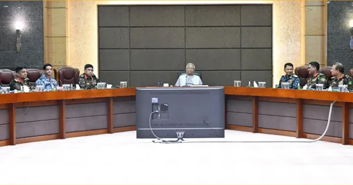 অবাধ, সুষ্ঠু, নিরপেক্ষ ও উৎসবমুখর নির্বাচনি পরিবেশ নিশ্চিত করতে সশস্ত্র বাহিনীকে সর্বোচ্চ সতর্কতা অবলম্বনের নির্দেশ দিয়েছেন প্রধান উপদেষ্টা অধ্যাপক মুহাম্মদ ইউনূস।তিনি বলেন, আগামী ১২ ফেব্রুয়ারি অনুষ্ঠিতব্য গণভোট ও ত্রয়োদশ জাতীয় সংসদ নির্বাচন বাংলাদেশের গণতান্ত্রিক ভবিষ্যতের জন্য একটি গুরুত্বপূর্ণ সন্ধিক্ষণ। এই সংবেদনশীল সময়ে একটি অবাধ, সুষ্ঠু, নিরপেক্ষ ও উৎসবমুখর নির্বাচনি পরিবেশ নিশ্চিত করতে বাংলাদেশ সশস্ত্র বাহিনীর ভূমিকা অত্যন্ত গুরুত্বপূর্ণ।সোমবার (২৬ জানুয়ারি) সেনাসদরে তিন বাহিনীর প্রধানসহ সশস্ত্র বাহিনীর জ্যেষ্ঠ কর্মকর্তাদের সঙ্গে মতবিনিময় সভায় দেওয়া ভাষণে তিনি এসব কথা বলেন। পরে প্রধান উপদেষ্টার উপ-প্রেস সচিব আবুল কালাম আজাদ মজুমদার এ তথ্য জানান।প্রধান উপদেষ্টা বলেন, জনগণের আস্থার প্রতীক হিসেবে সশস্ত্র বাহিনী অতীতের মতো এবারও পেশাদারত্ব, নিরপেক্ষতা ও দায়িত্বশীলতার সঙ্গে তাদের ওপর অর্পিত দায়িত্ব পালন করবে—এ বিষয়ে সরকার আশাবাদী।প্রধান উপদেষ্টা মহান মুক্তিযুদ্ধ ও জুলাই-আগস্টের ছাত্র-জনতার অভ্যুত্থানে শহীদদের প্রতি গভীর শ্রদ্ধা জানান এবং দেশের শান্তি ও স্থিতিশীলতা রক্ষায় সশস্ত্র বাহিনীর অবদান কৃতজ্ঞতার সঙ্গে স্মরণ করেন।