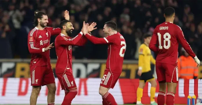 এফএ কাপের শেষ ষোলোর লড়াইয়ে দাপুটে জয় তুলে নিয়ে কোয়ার্টার ফাইনালে জায়গা করে নিয়েছে লিভারপুল। শুক্রবার রাতে উলভারহ্যাম্পটন ওয়ান্ডারার্সকে ৩-১ গোলে হারিয়ে পরের রাউন্ডে উঠেছে আর্নে স্লটের শিষ্যরা।এই জয়ে কিছুটা স্বস্তি মিলেছে লিভারপুল কোচ আর্নে স্লটের জন্যও। ম্যাচে অপ্রত্যাশিত নায়ক হয়ে ওঠেন স্কটিশ ডিফেন্ডার অ্যান্ডি রবার্টসন। তিনি প্রথমে নিজে গোল করে দলকে এগিয়ে দেন, পরে তার ক্রস থেকেই গোল করেন মোহাম্মদ সালাহ।ম্যাচের প্রথমার্ধে বেশ আক্রমণাত্মক খেললেও গোল পায়নি লিভারপুল। ১৭ বছর বয়সী উইঙ্গার রিও এনগুমোহা দুর্দান্ত পারফরম্যান্স দেখিয়ে উলভস ডিফেন্সকে বারবার সমস্যায় ফেলেন। তার গতি ও আক্রমণাত্মক খেলায় বেশ কয়েকবার সুযোগ তৈরি হয়।প্রথমার্ধে কোডি গাকপো একটি হেড পোস্টে মারেন, যদিও পরে অফসাইডের সংকেত দেন লাইন্সম্যান। এছাড়া অ্যালেক্সিস ম্যাক অ্যালিস্টার ও এনগুমোহার শট ঠেকান উলভস গোলরক্ষক স্যাম জনস্টোন। বেশ কয়েকটি সুযোগ তৈরি হলেও গোলশূন্যভাবেই শেষ হয় প্রথমার্ধ।দ্বিতীয়ার্ধের শুরুতেই ম্যাচের মোড় ঘুরে যায়। ৫০ মিনিটের দিকে নিজেদের অর্ধ থেকে বল কুড়িয়ে আক্রমণ শুরু করেন এনগুমোহা। দ্রুত পাস বিনিময়ের পর বল যায় অ্যান্ডি রবার্টসনের কাছে, আর বক্সের বাইরে থেকে নেওয়া তার জোরালো শট জালে জড়িয়ে লিভারপুলকে এগিয়ে দেয়।