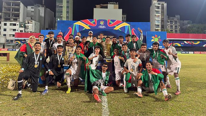 সাফ অনূর্ধ্ব-২০ চ্যাম্পিয়নশিপের ফাইনালে ভারতকে হারিয়ে চ্যাম্পিয়ন হয়েছে বাংলাদেশ। শুক্রবার রাতে মালদ্বীপের মালেতে হওয়া ফাইনালে টাইব্রেকারে ৪-৩ গোলে ভারতকে পরাজিত করেছে বাংলাদেশ।গত বছর ভারতের অরুণাচলে সাফ অনূর্ধ্ব-১৯ চ্যাম্পিয়নশিপের ফাইনাল শেষে কান্নায় ভেঙে পড়েছিলেন বাংলাদেশের যুবারা। মুর্শেদ-ফয়সালরা স্বাগতিক ভারতের কাছে হেরেছিল টাইব্রেকারে। এবার বাংলাদেশ সেই প্রতিশোধ নিলো অনূর্ধ্ব-২০ চ্যাম্পিয়নশিপের শিরোপা জিতে।রোনান সুলিভান। শুরু করেছিলেন স্বপ্নের মতো। শেষটাও করলেন তেমনভাবে। যুক্তরাষ্ট্র প্রবাসী এই ফুটবলার জোড়া গোল করে প্রথম ম্যাচে পাকিস্তানকে হারিয়েছিলেন। ফাইনালে টাইব্রেকারে শেষ শটটি লক্ষভেদ করে তিনি আনন্দের বন্যায় ভাসিয়ে দিলেন দেশের ফুটবলামোদীদের।