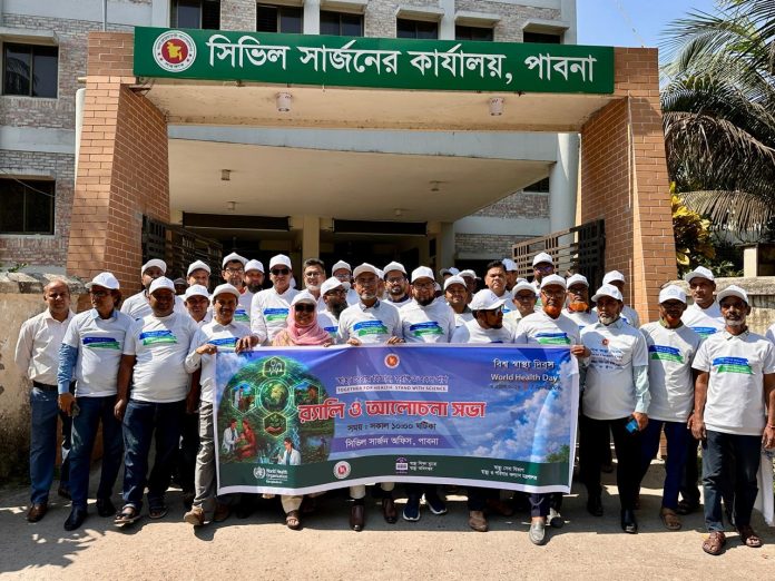 এস এম আলম, ৭ এপ্রিল: “স্বাস্থ্য সেবায় বিজ্ঞান,সুরক্ষিত সকল প্রাণ” এই প্রতিপাদ্যকে সামনে রেখে সারা বিশ্বের ন্যায় বাংলাদেশেও বিশ্ব স্বাস্থ্য দিবস পালিত হচ্ছে। পাবনা জেলায় সিভিল সার্জন অফিস, যথাযোগ্য মর্যাদায় দিবসটি পালনের আয়োজন করে। র্যালী পরবর্তী আলোচনা সভায় সভাপতি সিভিল সার্জন ডা. আবুল কালাম আজাদ এর সভাপতিত্বে আলোচনা সভা অনুষ্ঠিত হয়। আলোচনা সভায় উপস্থিত ছিলেন পাবনা সদর উপজেলার উপজেলা স্বাস্থ্য ও পরিবার পরিকল্পনা কর্মকর্তা ডা. জান্নাতুল ফেরদৌস বৈশাখী, ডেপুটি সিভিল সার্জন ডা. মো: খায়রুল কবির, সিভিল সার্জন অফিস ও পাবনা সদর উপজেলার মেডিকেল অফিসারবৃন্দ। মূল প্রবন্ধ উপস্থাপনা করেন বিশ্ব স্বাস্থ্য সংস্থার প্রতিনিধি ডা. মো: রাশিদুল বারী। এছাড়াও উপস্থিত ছিলেন ব্র্যাক, আসিয়াব, ওয়াই, ডব্লিউ সি এ সহ বিভিন্ন এনজিও প্রতিনিধি, সিভিল সার্জন অফিস ও পাবনা সদর উপজেলার বিভিন্ন পর্যায়ের কর্মকর্তা ও কর্মচারীবৃন্দ, বিভিন্ন প্রেস মিডিয়ার সাংবাদিকবৃন্দ।”স্বাস্থ্য সেবায় বিজ্ঞান, সুরক্ষিত সকলপ্রাণ” এই প্রতিপাদ্য কে সামনে রেখে বিজ্ঞানের কল্যাণকর ব্যাবহার নিশ্চিত করার মাধ্যমে সকলের সুস্বাস্থের বিধান করার বিষয়ে সভায় আলোচনা করা হয়। আগামীর বিশ্ব যেন সকলের জন্য স্বাস্থ্যকর ও নিরাপদ হয় এই অঙ্গীকার ব্যাক্ত করা হয়।