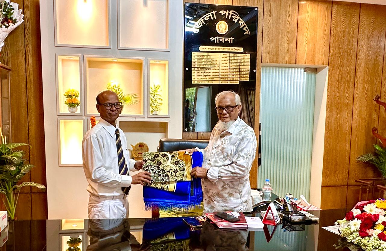 এস এম আলম, ৮ এপ্রিল: পাবনার জেলা পরিষদের নবাগত প্রশাসক যুদ্ধাহত বীর মুক্তিযোদ্ধা মোহাম্মদ জহুরুল ইসলাম বিশু – কে ফুলের শুভেচ্ছা প্রদান করেন বাংলা টিভির জেলা প্রতিনিধি ও অনলাইন পত্রিকা ’নতুন চোখ’ এর প্রকাশক এস এম আলম।