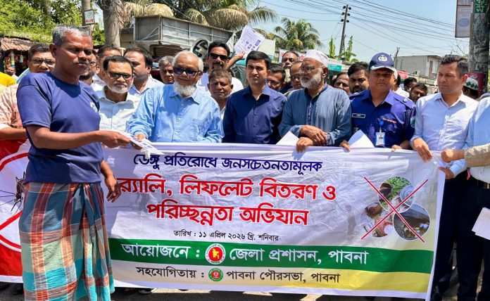 এস এম আলম, ১১ এপ্রিল: পাবনায় ডেঙ্গু প্রতিরোধে জনসচেতনতামুলক র্যালী, লিফলেট বিতরণ ও পরিচ্ছন্নতা অভিযান অনুষ্ঠিত হয়েছে। সকালে জেলা প্রশাসনের আয়োজনে পাবনা পৌরসভার সহযোগিতায় জেলা চাঁদমারী মৌজার নয়নামতি পুকুরে পরিচ্ছন্নতা অভিযান চালানো হয়। অভিযানে উপস্থিত ছিলেন জেলা প্রশাসক আমিনুল ইসলাম, জেলা পরিষদের প্রশাসক যুদ্ধাহত বীর মুক্তিযোদ্ধা জহুরুল ইসলাম বিশু, পৌর প্রশাসক ও অতিরিক্ত জেলা প্রশাসক (শিক্ষা ও আইসিটি) মনিরুজ্জামান, অতিরিক্ত পুলিশ সুপার সদর সার্কেল শরিফুল ইসলাম, উপজেলা নির্বাহী কর্মকর্তা তামারা তাসবিহা, সহকারী কমিশনার ভূমি এস এম ফুয়াদ, এনডিসি মো: মনিরুজ্জামান, প্রেসক্লাবের সাধারণ সম্পাদক জহুরুল ইসলাম, বাংলা টিভির জেলা প্রতিনিধি ও অনলাইন পত্রিকা নতুন চোখ এর প্রকাশক এস এম আলম সহ জেলা প্রশাসনের কর্মকর্তাগণ, বিএনপি নেতৃবৃন্দ ও পৌরসভার কর্মকর্তা-কর্মচারীবৃন্দ।