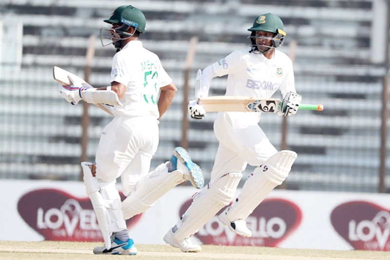 দিনের শুরুতে লিটন দাস আউট হয়ে যাওয়ার পরই মাঠে নামেন মিরাজ। ৬৭ রানের জুটি গড়েন তিনি সাকিবের সঙ্গে। এরপর তাইজুল ইসলামকে নিয়ে গড়েন ৪৬ রানের জুটি। তাইজুল আউট হন ১৮ রান করে। নাঈম হাসানকে নিয়েও অনেক দুরের পথ পাড়ি দেন মিরাজ। গড়েন ৫৭ রানের জুটি।