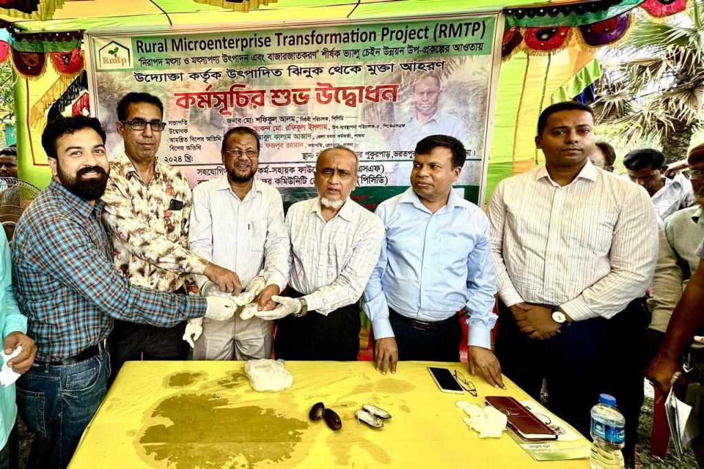 এস এম আলম, ১ জুন: মৎস্য ও মৎস্য জাতীয় পন্য উৎপাদন ও বাজারজাত করন প্রকল্পের আওতায় পাবনায় শুরু হয়েছে ঝিনুক থেকে মুক্তা আহরন কর্মসূচী। দুপুরে আটঘরিয়ার ভরতপুরে প্রধান অতিথি হিসেবে এ কাজের উদ্বোধন করেন পল্লী কর্ম সহায়ক ফাউন্ডেশনের উপ-ব্যবস্থাপনা পরিচালক ড. আকন্দ মো: রফিকুল ইসলাম। প্রোগ্রাম ফর কমিউনিটি ডেভলপমেন্টের নির্বাহী পরিচালক মো: শফিকুল ইসলামের সভাপতিত্বে মুক্তা চাষী সমাবেশে বক্তব্য দেন জেলা মৎস্য কর্মকর্তা আবুল কালাম আজাদ ও মাছরাঙা টেলিভিশনের বিশেষ প্রতিনিধি ও পাবনা প্রেসক্লাবের সাবেক স¤পাদক উৎপল মির্জা। এসময় উপস্থিত ছিলেন অনলাইন পত্রিকা নতুন চোখ এর প্রকাশক ও বাংলা টিভির জেলা প্রতিনিধি এস এম আলম, দৈনিক প্রথম আলোর প্রতিনিধি সরোয়ার উল্লাস, এটিএন নিউজের স্টাফ রিপোর্টার রিজভী জয়, সাংবাদিক কামাল আহমেদ সিদ্দিকী। অনুষ্ঠানে প্রধান অতিথি পল্লী কর্ম সহায়ক ফাউন্ডেশনের উপ-ব্যবস্থাপনা পরিচালক ড. আকন্দ মো: রফিকুল ইসলাম বলেন, মাছের পাশপাশি মুক্তা চাষ করে যে কোন উদ্যোক্তা দ্রুত ভাগ্য পরিবর্তন করতে পারেন। এ কারনে দ্রুত জনপ্রিয় হচ্ছে এ প্রকল্পটি। অনুষ্ঠানের আয়োজক প্রতিষ্ঠান প্রোগ্রাম ফর কমিউনিটি ডেভলপমেন্ট পিসিডির নির্বাহী পরিচালক মো: শফিকুল ইসলাম বলেন, এ প্রকল্পের আওতায় পিসিডির আর্থিক ও প্রযুক্তিগত সহায়তায় ইতোমধ্যেই ৩৩ জন উদ্যোক্তা নিজেদের ভাগ্য বদলে ফেলেছে। আগামী অর্থ বছরে আরো ১০ জনকে এ প্রকল্পের আওতায় আনা হবে। পরে সফল মুক্তাচাষীদের প্রকল্প পরিদর্শন করেন ফাউন্ডেশনের উপ-ব্যবস্থাপনা পরিচালক।